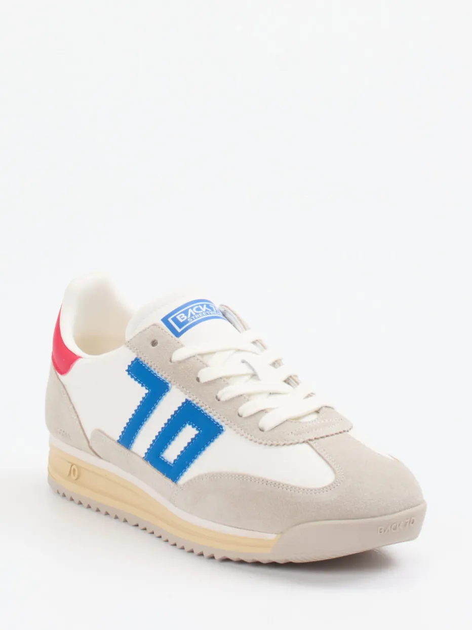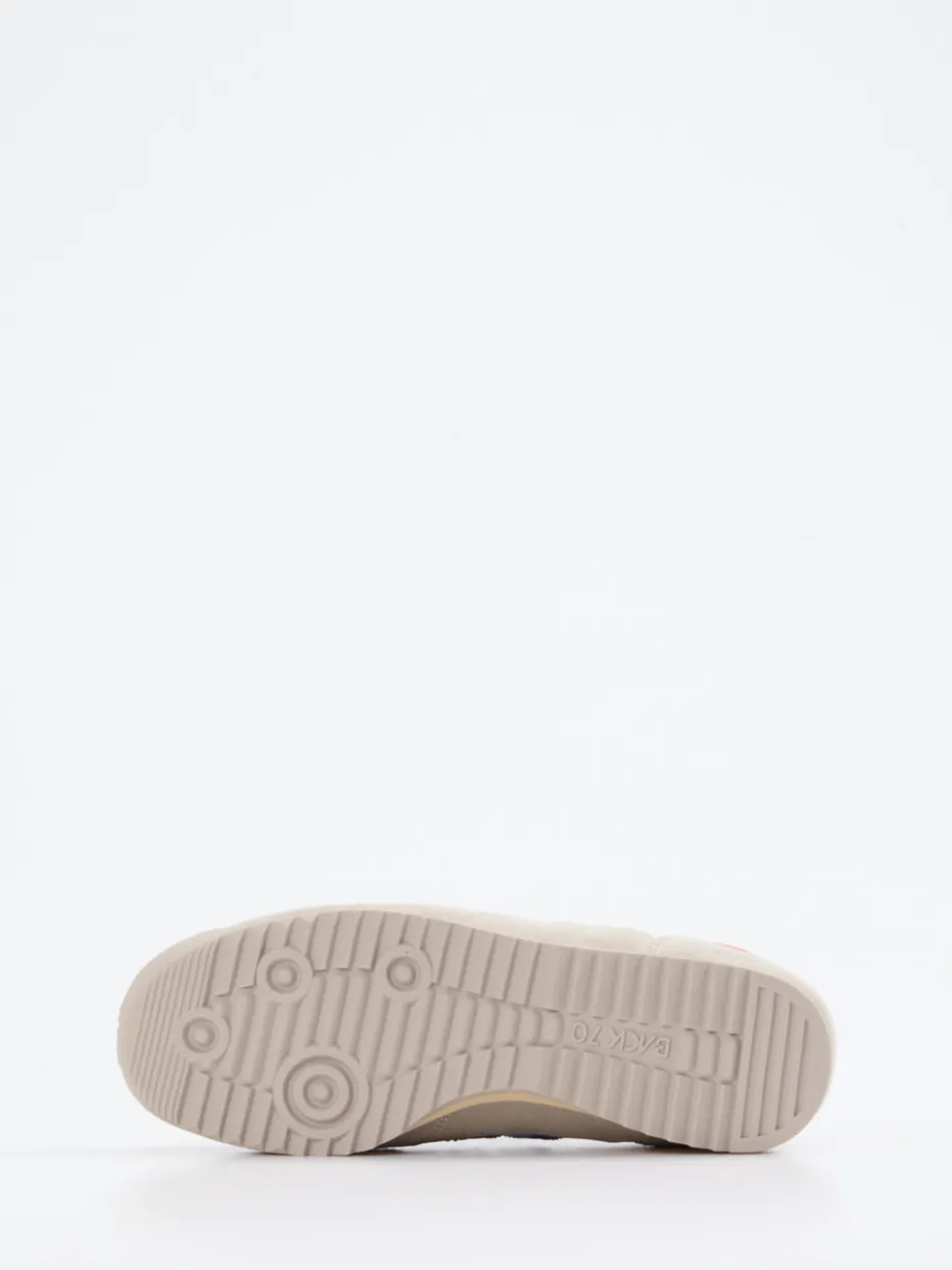 Stilvoller Vintage-Charme mit modernem Komfort.Die Marke Back 70 bringt mit diesem Sneaker italienisches Design und Retro-Flair zusammen. Ideal für urbane Freizeitlooks kombiniert das Modell weiches Kalbleder mit samtigem Veloursleder in Offwhite und Grau. Kontrastierende Details in Rot und Blau – darunter das auffällige seitliche ’70‘-Logo – sorgen für markante Akzente. Die flach zulaufende Silhouette, atmungsaktives Textilfutter und eine stoßdämpfende Gummisohle mit Profilstruktur bieten ganztägigen Tragekomfort. Als Teil des „Retro Runner Revival“-Trends lässt sich der Schuh optimal mit sportlicher Streetwear kombinieren. Ein Statement-Sneaker der Marke Back 70 mit charakterstarker Ästhetik und funktionalem Aufbau.