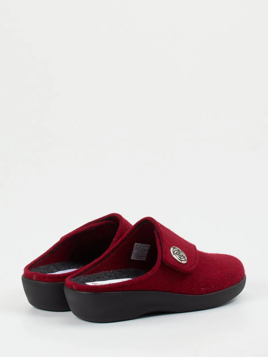 Komfort trifft Design im Winteralltag.Der Damenhausschuh Teresa von Berkemann bietet entspannten Wohnkomfort im stilvollen Look. Ob beim Morgenkaffee oder abends vorm Kamin – der dunkelrote Filzpantoffel mit mattierter Oberfläche schenkt wohltuende Wärme und ein angenehmes Tragegefühl. Die geschlossene Front und offene Ferse sorgen für einfaches Hineinschlüpfen, während der Klettverschluss mit silberfarbenem Rosenknopf einen dekorativen Akzent setzt. Die ergonomisch geformte Gummisohle ist leicht keilförmig und verleiht sicheren Halt auf glatten Böden. Ideal für Liebhaberinnen minimalistischer Cozywear mit gemütlicher Ausstrahlung. Ein durchdachtes Wohlfühlprodukt mit Qualitätssignatur von Berkemann.