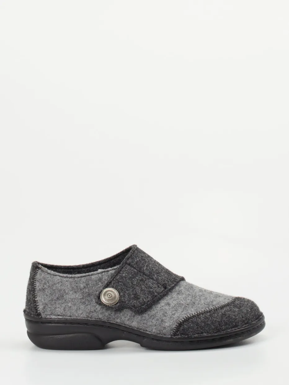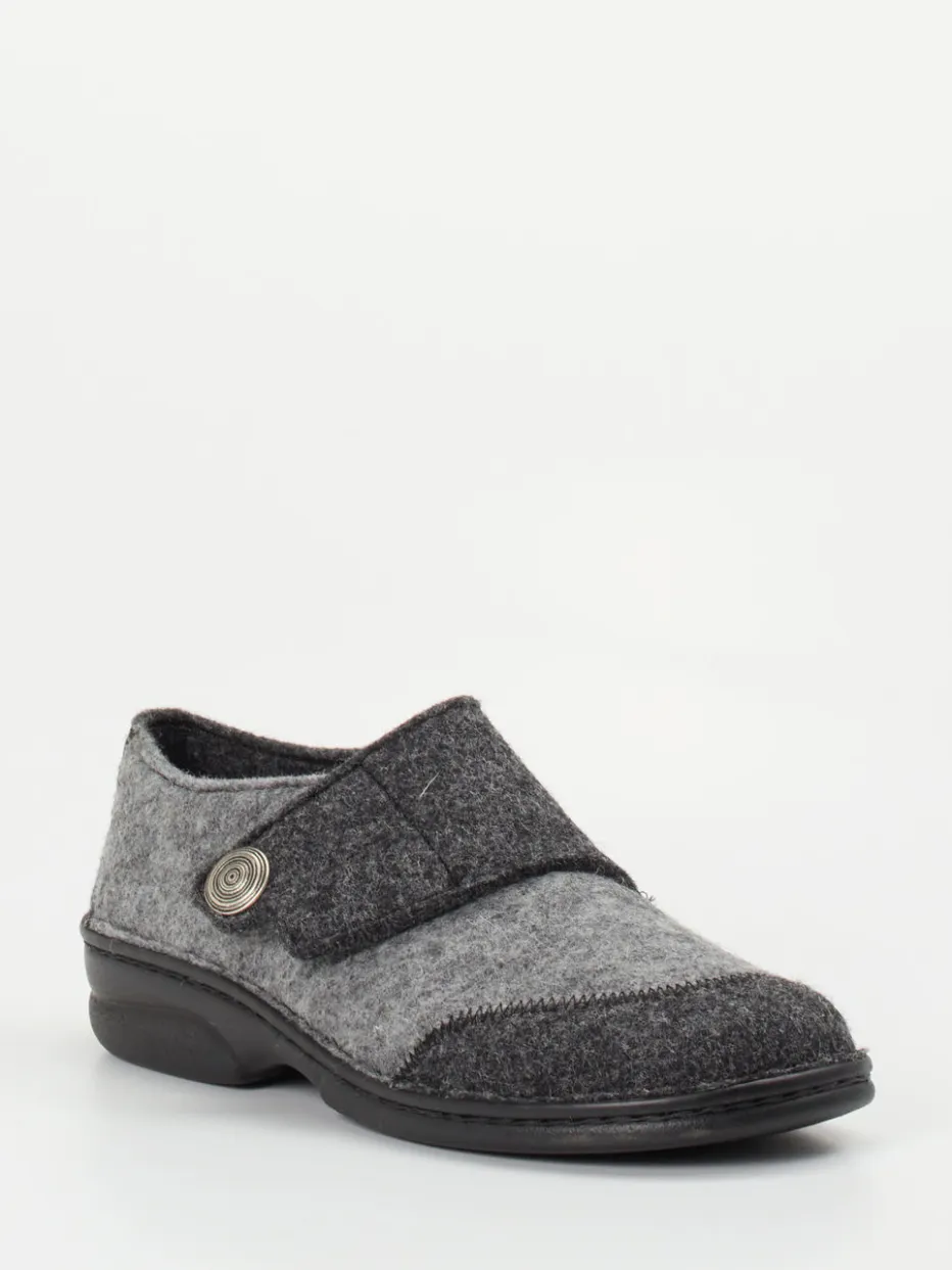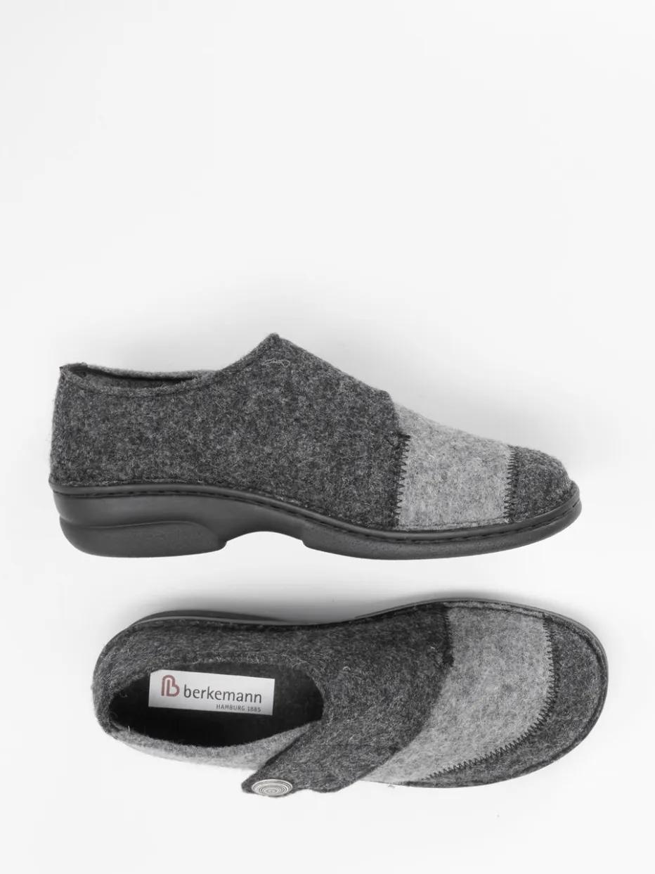 Wärme trifft Komfort im Alltag.Berkemann präsentiert einen Damen-Hausschuh, der behaglichen Komfort stilvoll umsetzt. Ideal für entspannte Tage rund ums Haus überzeugt das Modell mit einem Obermaterial aus samtig-filzigem Wollfilz in hell- und dunkelgrauen Nuancen. Die geschlossene, rund geformte Silhouette wird durch einen breiten Klettverschluss mit dekorativem Spiral-Zierknopf ergänzt. Innen sorgt eine warme Textilfaser für Wohlgefühl, während die ergonomisch geformte Gummilaufsohle rutschhemmend wirkt. Das Design folgt der ruhigen Eleganz des Quiet-Luxury-Trends und unterstreicht ein natürlich inspiriertes Wohngefühl. Besonders harmonisch zu Wollsocken oder lässigem Hausanzug. Berkemann bietet hier kompromisslose Funktion in alltagstauglich-reduzierter Form.