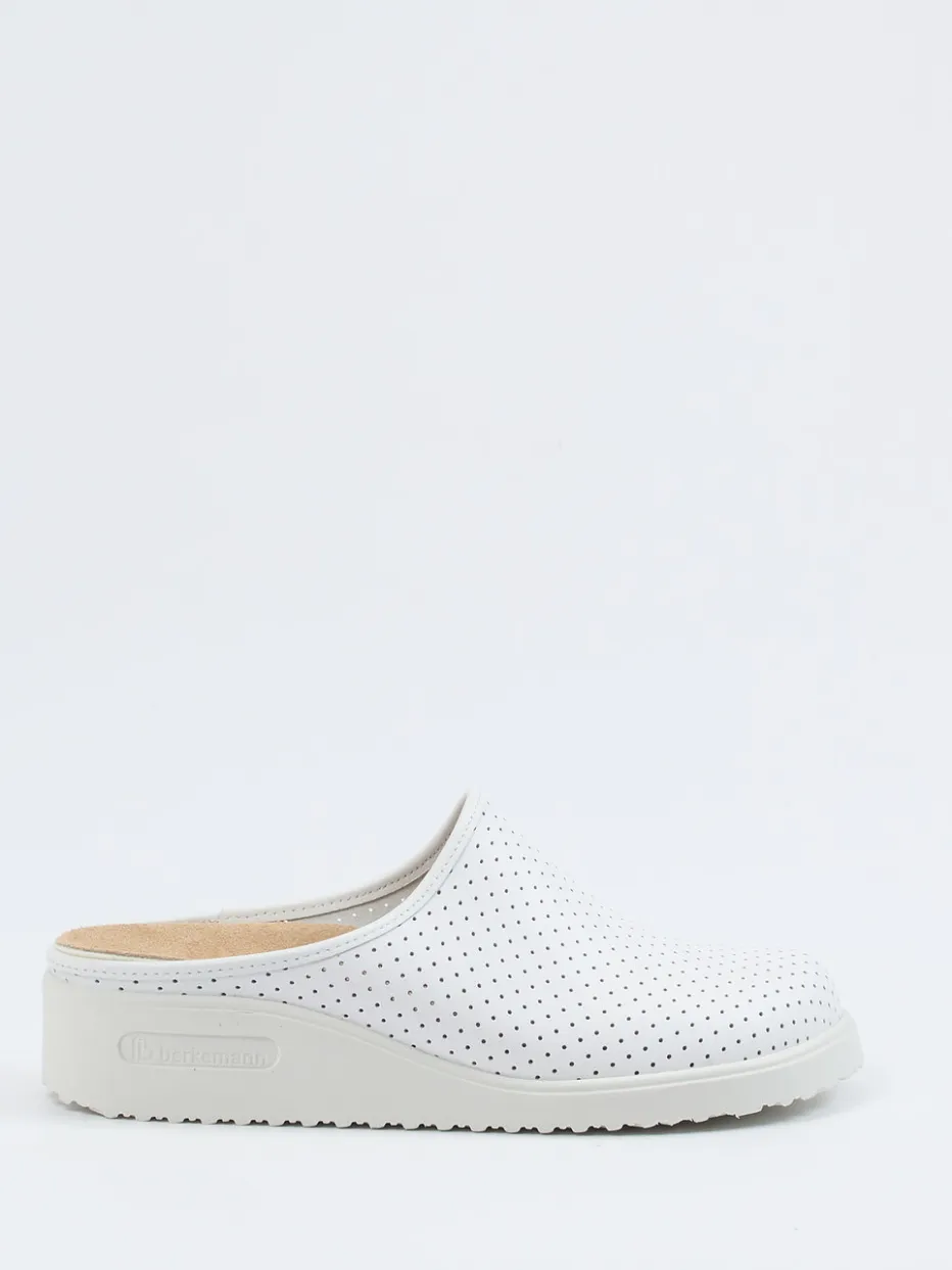 Funktionalität trifft auf schlichte Eleganz.Dieser Komfort-Clog von Berkemann vereint zeitloses Design mit gesunder Fußunterstützung. Ideal für entspannte Tage zu Hause oder den Alltag bietet das Modell aus weißem Kalbleder mit matter Oberfläche ein perforiertes Obermaterial, das für angenehme Belüftung sorgt. Die ergonomische, hinten offene Form unterstützt ein natürliches Laufgefühl – ergänzt durch ein lederbezogenes Wechselfußbett und eine rutschhemmende PU-Sohle mit leichtem Keilabsatz. Dezente Linienführung und die tonale Einfassung betonen den minimalistischen Charakter, während das Innenfutter aus Leder den Komfort abrundet. Gut kombinierbar mit Loungewear oder leichten Casual-Outfits. Ein langlebiger Clog mit gesundheitsorientiertem Anspruch und Berkemann-Typik.