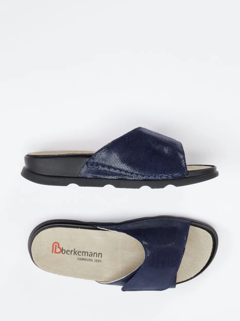 Schimmernder Komfort für jeden Tag.Die Marke Berkemann steht für durchdachte Bequemschuhe – diese Damen-Pantolette ist ein gutes Beispiel. Ob beim Frühstück auf der Terrasse oder beim gemütlichen Stadtbummel: Das geprägte Leder in tiefem Dunkelblau mit dezentem Glanz und Ton-in-Ton-Nähten verleiht dieser offenen, ergonomisch geformten Sandale ihr modernes Erscheinungsbild. Zwei Klettverschlüsse sorgen für optimalen Sitz, die gepolsterte Innensohle ist mit Veloursleder bezogen und eignet sich auch für eigene Einlagen. Die leichte PU-Sohle gibt Halt und unterstützt beim Gehen. Design und Funktion folgen dem Trend zu „Functional Footwear“ mit minimalistischer Eleganz. Berkemann überzeugt mit alltagstauglicher Ergonomie und hochwertiger Verarbeitung.