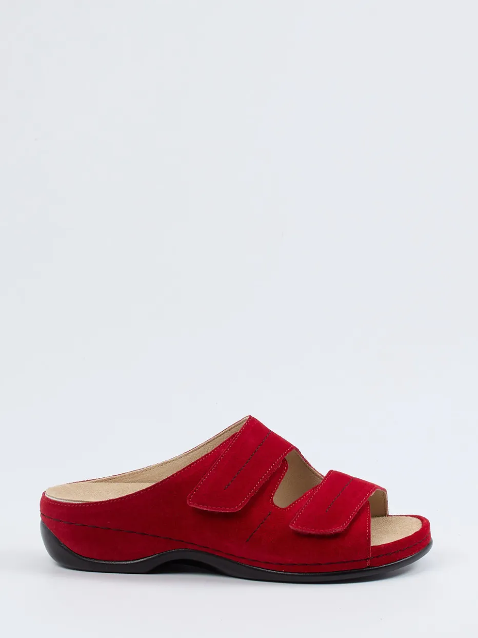 Das karminrote Veloursleder mit samtiger Oberfläche wirkt modern und zugleich stilvoll. Die ergonomisch geformte Silhouette mit zwei individuell verstellbaren Klettriemen bietet funktionalen Halt, während das gepolsterte, bei Bedarf austauschbare Fußbett für Gehkomfort sorgt. Schwarze Steppnähte setzen dezente Akzente, die profilierte Gummisohle rundet das funktionale Design ab. Ideal für komfortorientierte Looks mit leichten Sommerhosen oder Loungewear.