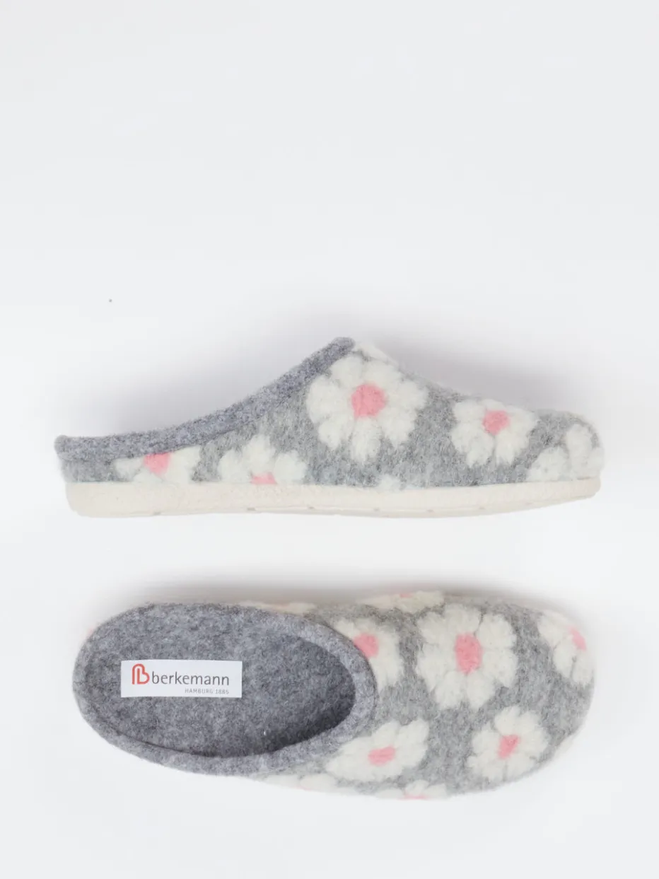 Wärmender Komfort mit floraler Note. Berkemann präsentiert einen Damen-Hausschuh in klassischer Pantoffelform für entspannte Momente im Alltag. Das Modell besteht aus weichem Filz mit flauschiger Oberfläche und zeigt ein zartes Blumenmuster in Rosa und Weiß auf hellgrauem Grund. Durch die offene Ferse lässt es sich bequem hineinschlüpfen; eine geformte Decksohle und profilierte Gummisohle sorgen für Stabilität und Trittsicherheit. Das Design greift den Cottagecore-Trend auf und passt zum Skandi-inspirierten Loungewear-Stil. Kombinierbar mit Kuschelsocken oder weichfallenden Hausanzügen. Ein Hausschuh voller Wohlfühlkomfort – typisch Berkemann.