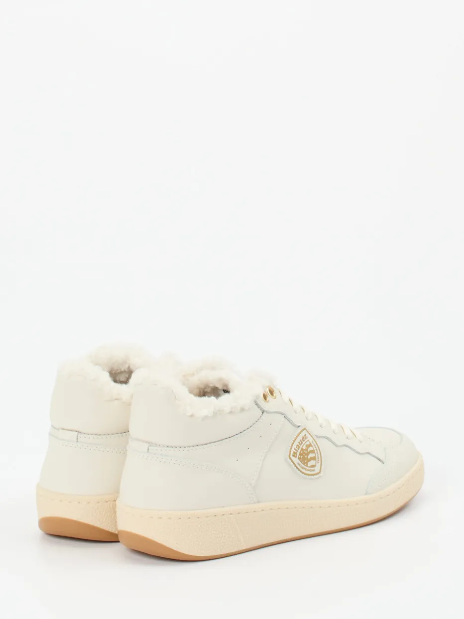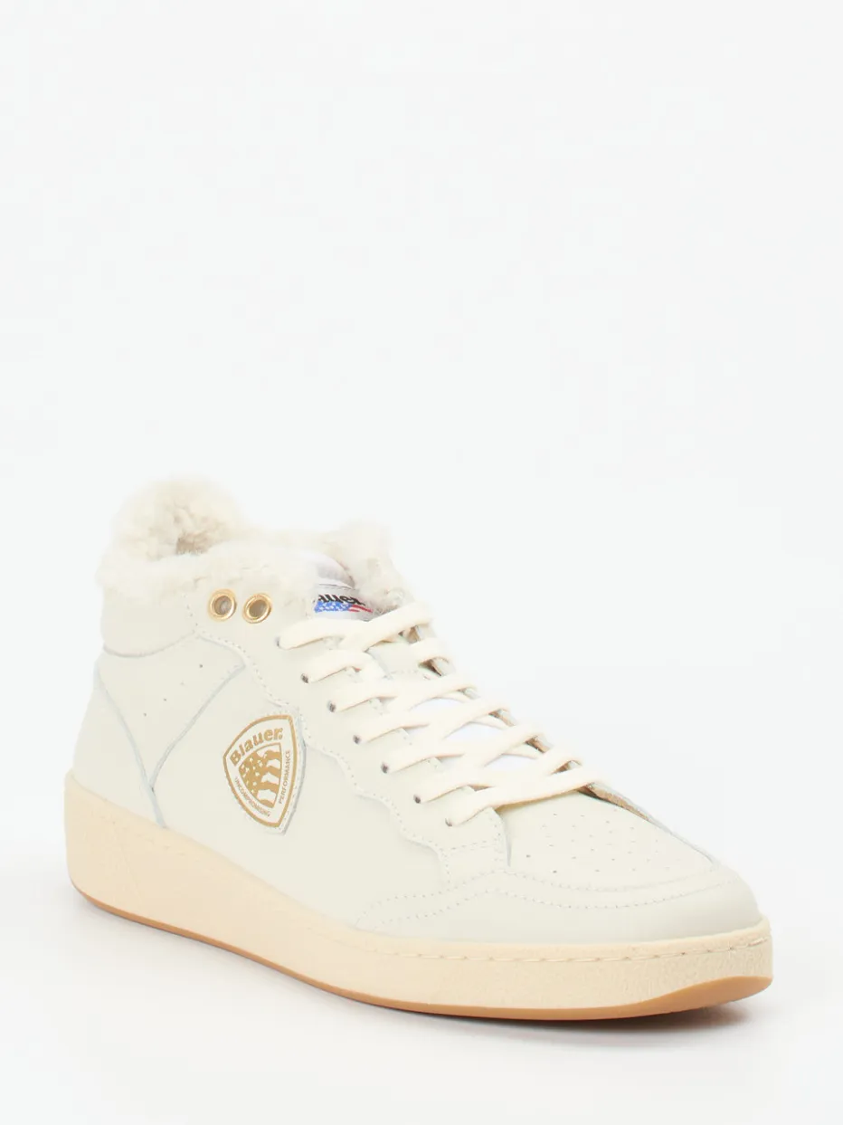 Der warme Mid-Top-Sneaker von Blauer verbindet glattes Kalbleder mit kuscheligem Innenfutter und stilvollen Goldakzenten – perfekt für kühle Tage in der Stadt.