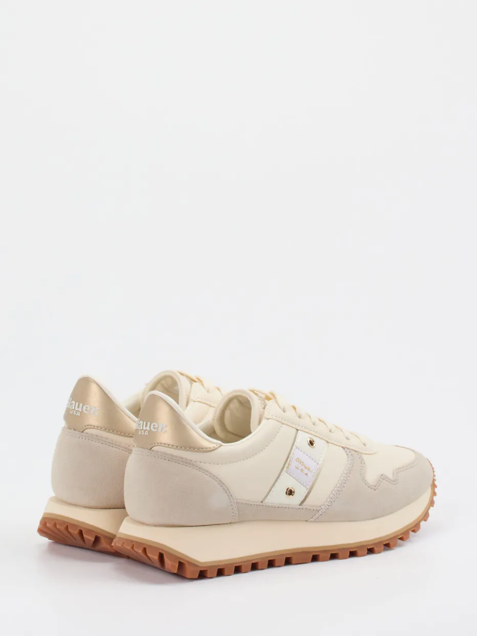 Der Sneaker von Blauer bringt Retro Runner Feeling in den Alltag. Optisch setzt das Modell auf natürliche Creme- und Beigetöne mit goldfarbenen Ösen und Logo-Print für einen dezenten Luxus-Twist.