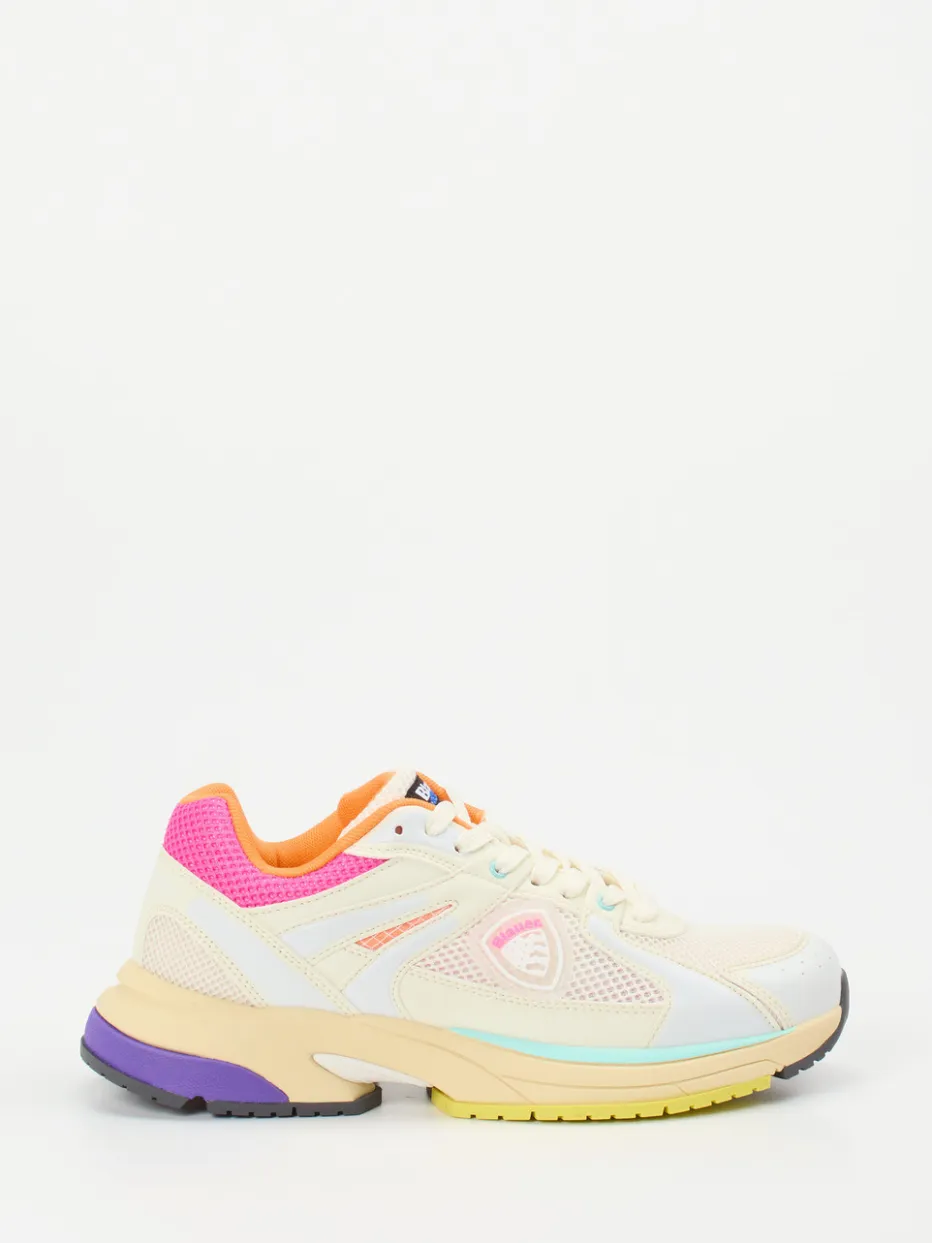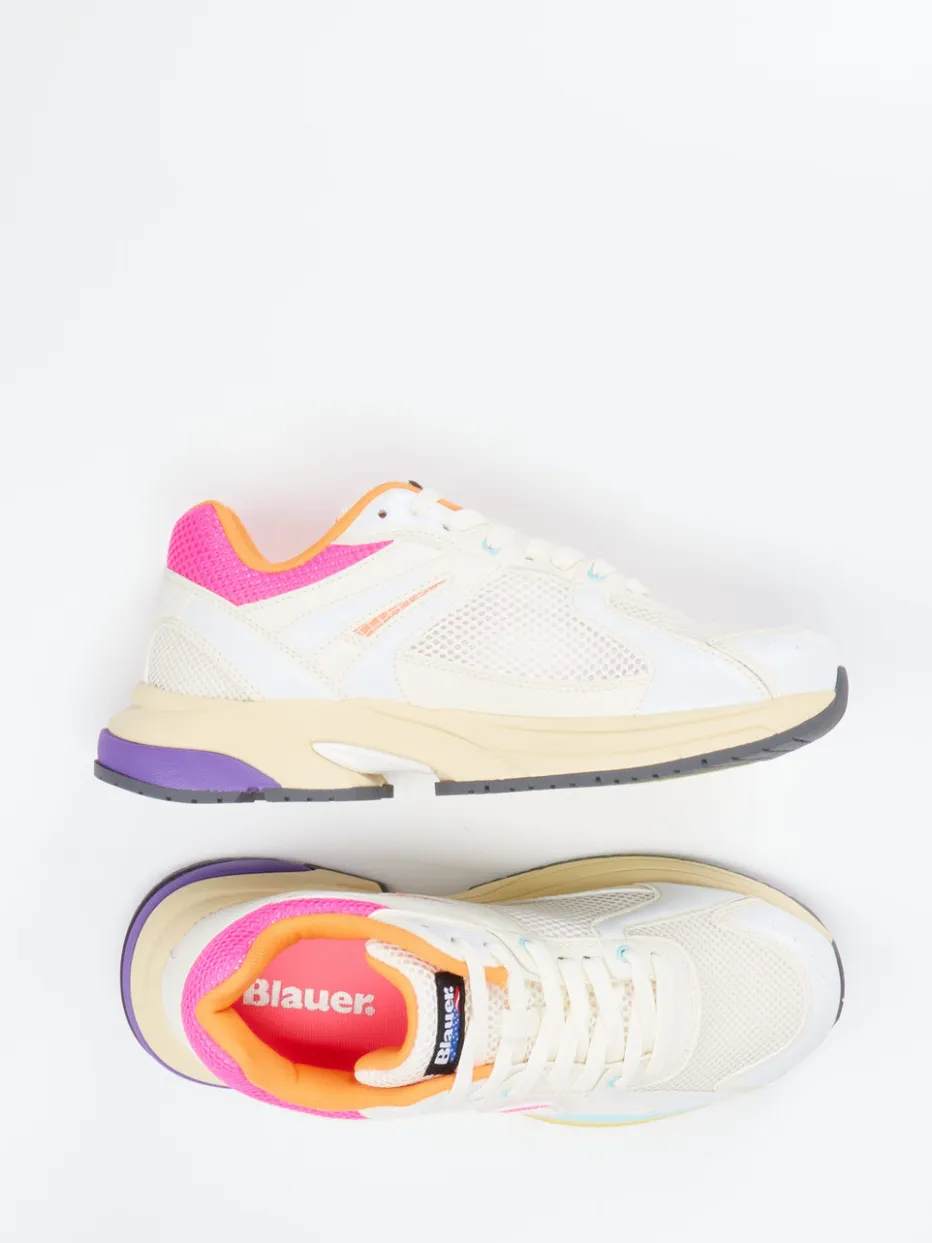 Farbstarker Akzent für urbane Looks.Der Retro-Sneaker von Blauer interpretiert klassische Running-Silhouetten mit modernem Flair. Ideal für Alltag und Freizeit, verbindet dieser Sneaker ein cremeweißes, strukturiertes Textil-Obermaterial mit dynamischen Einsätzen in Pink, Lila und Türkis. Mesh-Elemente sorgen für Atmungsaktivität, während die robuste Gummisohle mit mehrfarbigem Profil sicheren Tritt bietet. Ein gepolsterter Schaft, kontrastierendes Orange im Innenfutter sowie seitliche Logo-Patches sorgen für markante Details. Inspiriert vom Y2K-Trend, trifft das Design den Puls der Streetstyle-Saison Frühling/Sommer. Stil, Komfort und Retro-Spirit – vereint in einem progressiven Statement von Blauer.