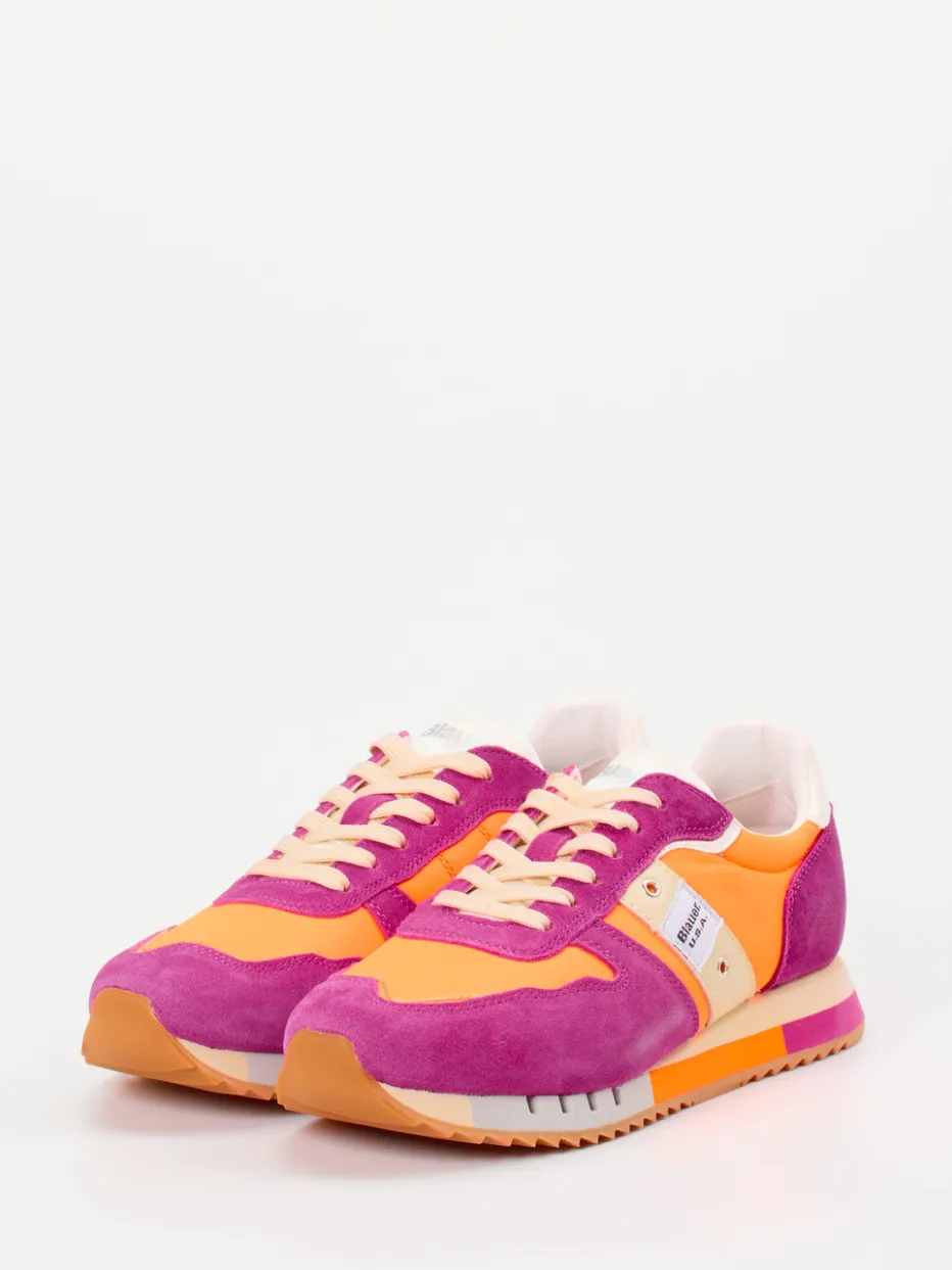 Sportliche Farbenkraft trifft Retro-Charme.Blauer interpretiert den klassischen Sneaker mit expressivem Color-Blocking neu. Veloursleder mit samtiger Textur in kräftigem Pink trifft auf orangene Textilflächen und markante Kontrastnähte. Die flache, zweifarbige Laufsohle mit Profil bietet sicheren Halt im Alltag, während seitliche Markenlabels das Design akzentuieren. Ideal für urbane Freizeitlooks oder sommerliche Streetwear-Outfits. Ein Hingucker mit klarer Formsprache – für trendorientierte Styles mit Charakter.