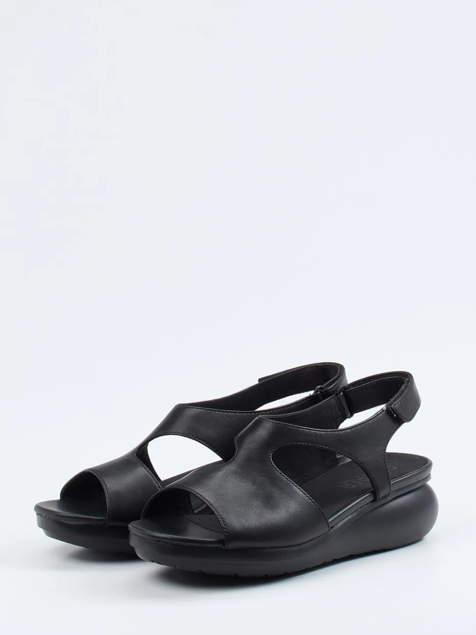 Extravagant, aber zugleich komfortabel präsentiert sich die Keilsandalette „Balloon“ der Marke Camper. Das schwarze Kalbleder zeigt sich auf einem ausgewogenen Leisten. Der Klettverschluss an der Ferse bietet funktionalen Komfort. Der Name „Balloon“ erklärt sich durch die ballonartige, betonte EVA-Sohle, die auch durch die lederbezogene Innensohle angenehme Trageeigenschaften garantiert.