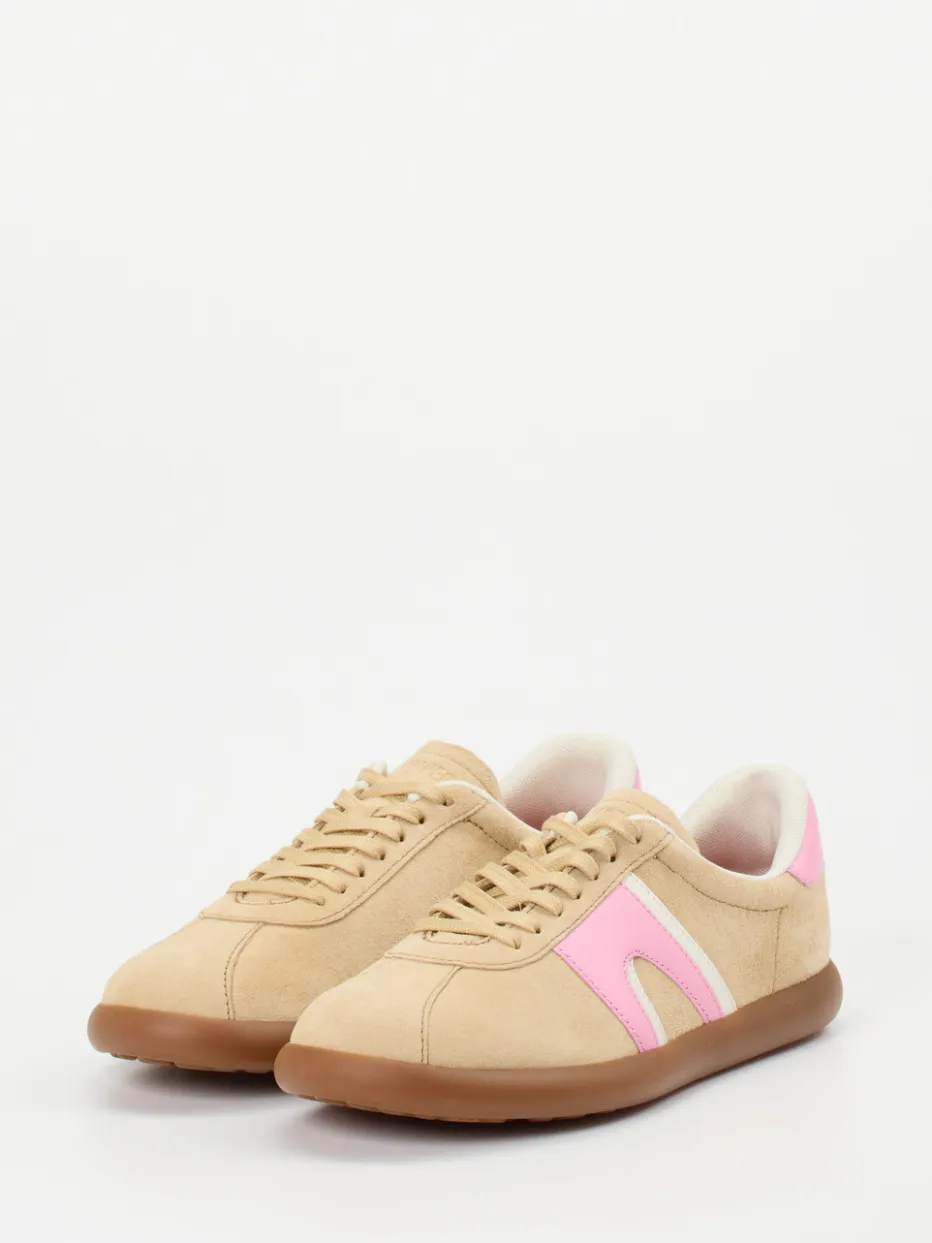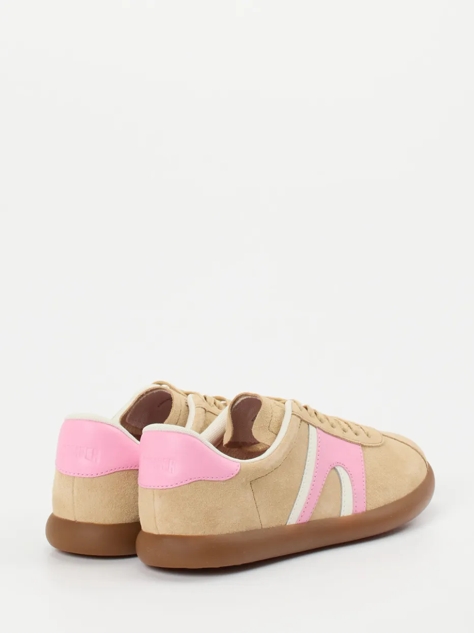 Camper präsentiert modische Low-Top-Sneaker für Damen aus hochwertigem Nubukleder.