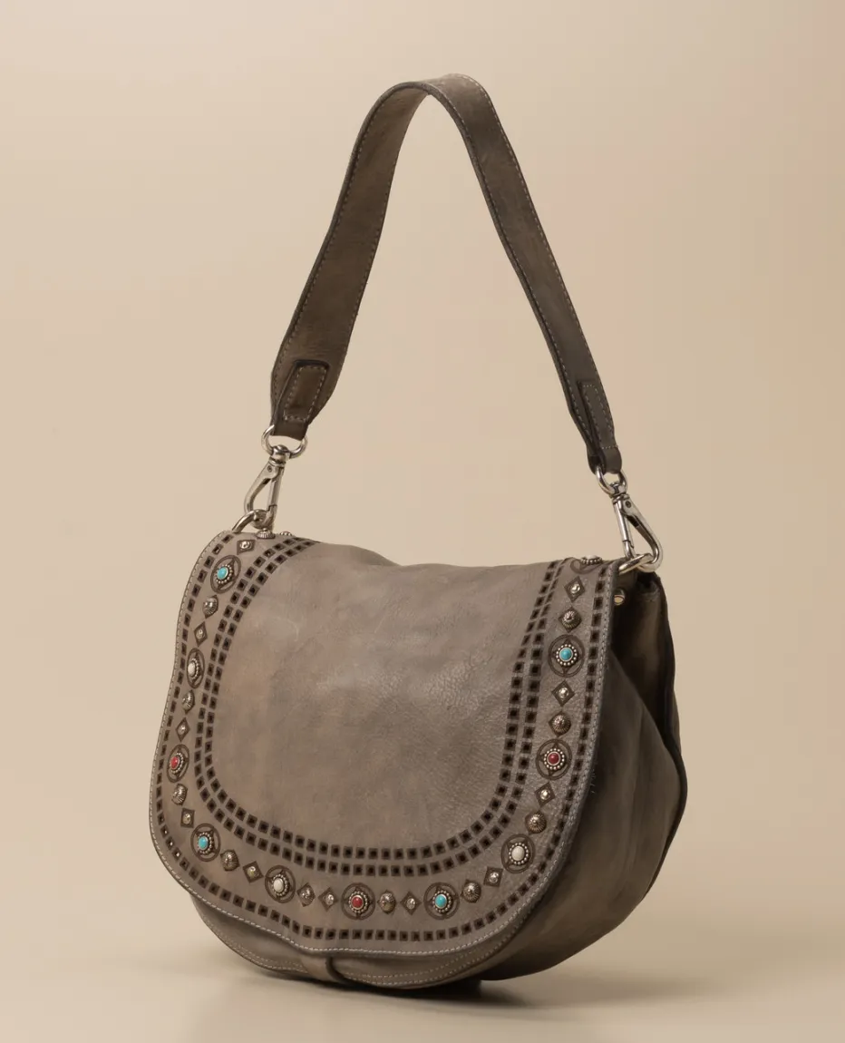 Die italienische Marke Campomaggi präsentiert diese hochwertige Umhängetasche, die durch hübsche Details auf sich aufmerksam macht. Das taupefarbene Kalbleder wird durch ein aufwendiges Perlen- und Nieten-Dekor im Ethno-Look stilecht in Szene gesetzt. Zusätzlich schmücken die braun umrandeten Lasercuts. Die dezente Sattelform vollendet das besondere Erscheinungsbild. – Obermaterial: Kalbleder – Futter: Kalbleder – Farbe: taupefarben – Größe: ca. 25 x 32 x 10 cm (H x B x T) – Henkel: ca. 45 cm, abnehmbar – Schulterriemen: max. ca. 130 cm, verstell- und abnehmbar – Verschluss: Überschlag mit Druckknopf – Innen: ein Reißverschlussfach, ein separates Steckfach mit Überschlag und Druckknopf – Extras: ein markeneigenes Pflegeset