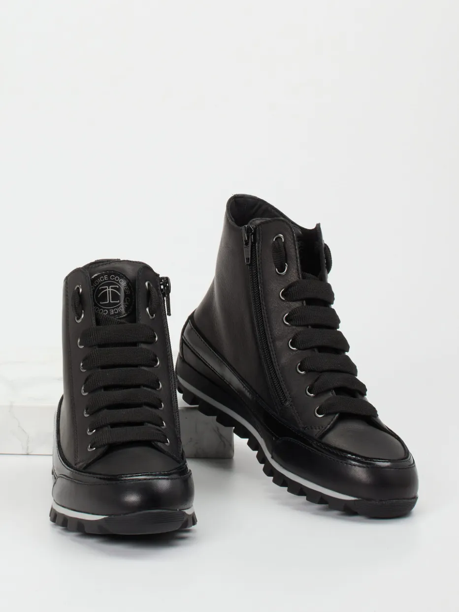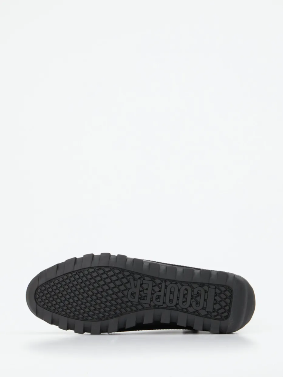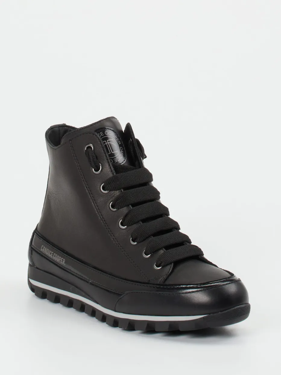 Schwarz trifft Funktion im Alltag.Candice Cooper bringt mit diesen Schnürboots ein Modell für Stadt und Outdoor heraus. Das schwarze Kalbleder ist strapazierfähig und weich zugleich, ergänzt durch eine matte Oberfläche mit Ton-in-Ton-Nähten. Die knöchelhohe Form, kombiniert mit seitlichem Reißverschluss und schwarzer Schnürung, sorgt für einfaches Handling. Die markant profilierte Gummisohle mit hellem Kontraststreifen bietet Trittsicherheit und betont den urbanen Charakter. Unauffällig platzierte Logoprägungen an Zunge und Seite runden das reduzierte Design ab. Inspiration aus Streetwear und Minimalismus verleiht dem Modell modische Stärke. Komfortabel, robust und stilvoll – für moderne Ansprüche gemacht.