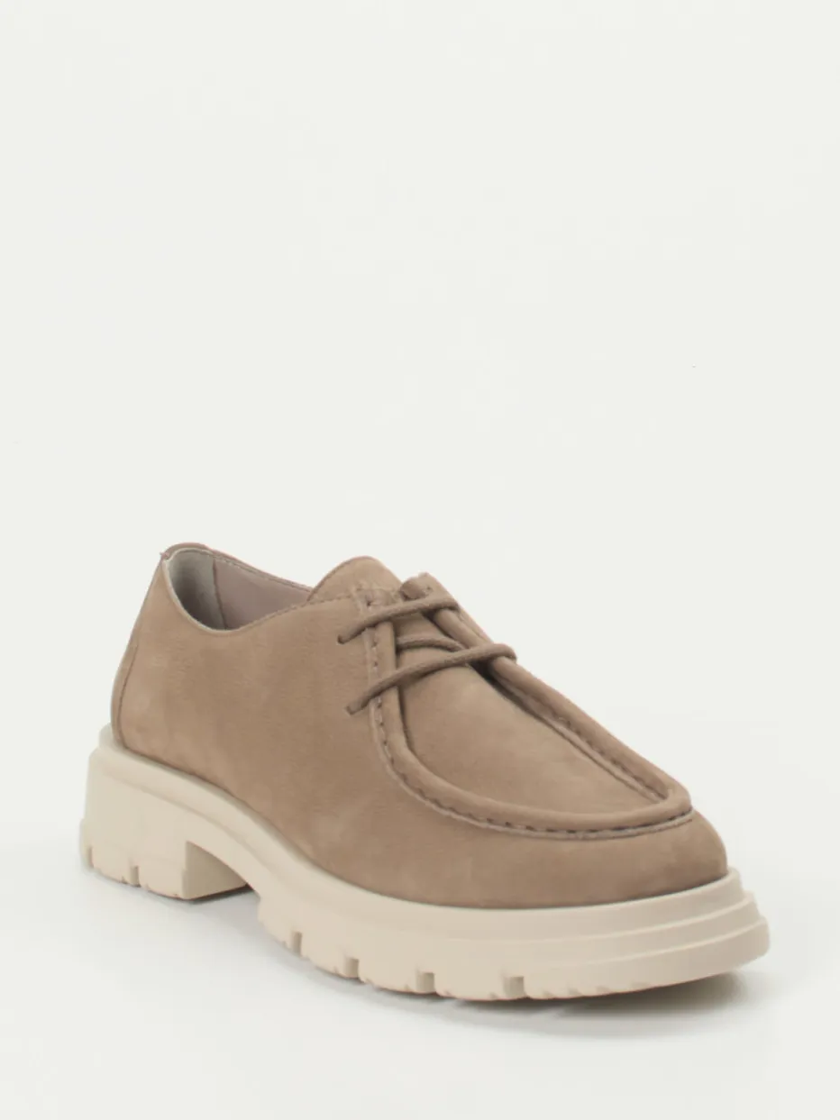 Dieser Schuh verbindet samtig angeschliffenes Nubukleder mit einer markant profilierten Chunky-Sohle – für moderne Looks zwischen Streetstyle und diskretem Luxus.