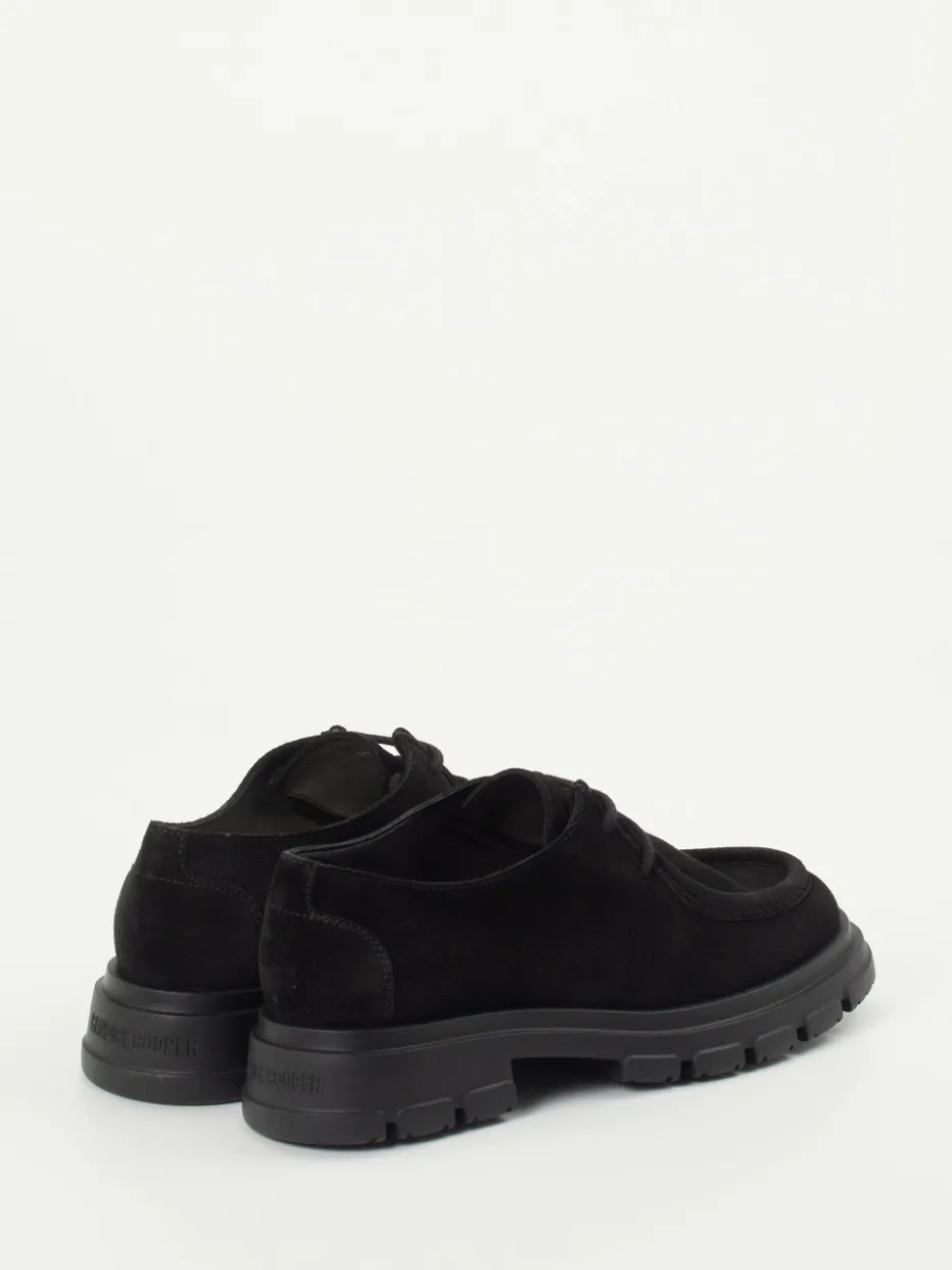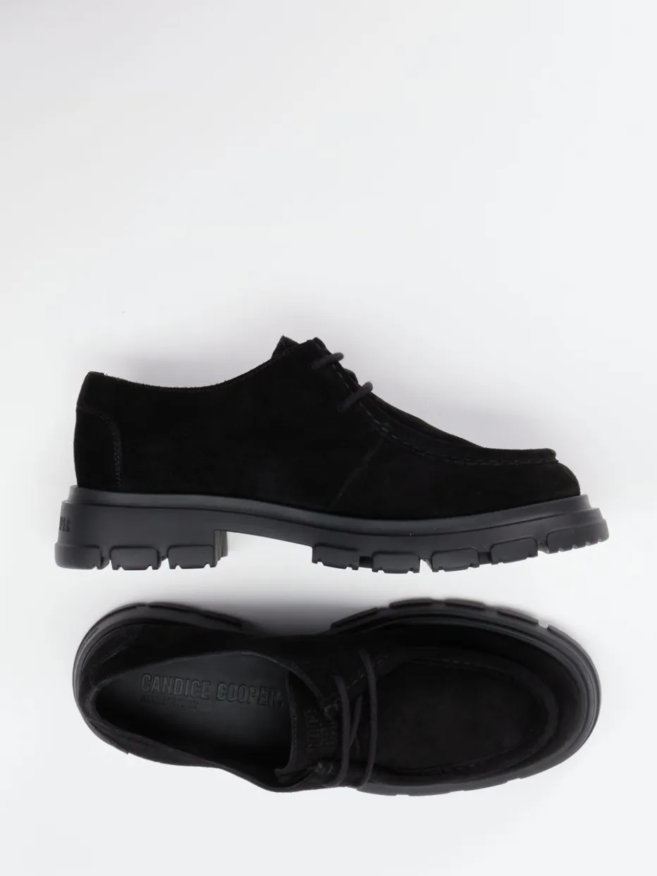 Schwarz trifft Struktur.Der Damen-Schnürschuh von Candice Cooper kombiniert klassische Mokassin-Elemente mit moderner Chunky-Silhouette. Ob für den Weg ins Büro oder entspannte City-Tage – das samtig-schwarze Veloursleder mit tonaler Mokassinnaht sorgt für eine elegante Optik mit textiler Tiefe. Die minimalistische Zweischnürung und die robuste, trittsichere Gummiprofilsohle ergänzen sich zu einem zeitgenössischen Streetwear-Statement. Ein weiches Kalblederfutter und ein bequem gepolstertes Fußbett garantieren ganztägigen Komfort. Als stilles Zeichen für Stil lassen sich dezente Brandings an Zunge und Ferse erkennen. Ein urbaner Allrounder mit Komfortprofil und klarer Handschrift von Candice Cooper.