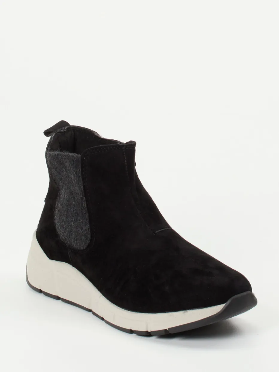 Sportiver Komfort im Winterlook.Christian Dietz präsentiert Chelsea-Stiefeletten für Damen mit bequemer H-Weite. Ob beim Stadtbummel oder fürs Homeoffice – das weiche Veloursleder in Schwarz mit matter Oberfläche und tonalen Nähten sorgt für stilvolle Zurückhaltung. Elastikeinsätze aus anthrazitfarbenem Filz fügen sich harmonisch ein, während ein Innenreißverschluss das Anziehen erleichtert. Die auffallende Chunky-Gummisohle in Offwhite unterstützt den entspannten Look, bietet Dämpfung und ist ein Trendstatement der Saison. Dank austauschbarem Korkfußbett auch für Einlagen geeignet. Ein weich flexibel verarbeiteter Alltagsschuh mit Anspruch an Komfort und klarer Formensprache.