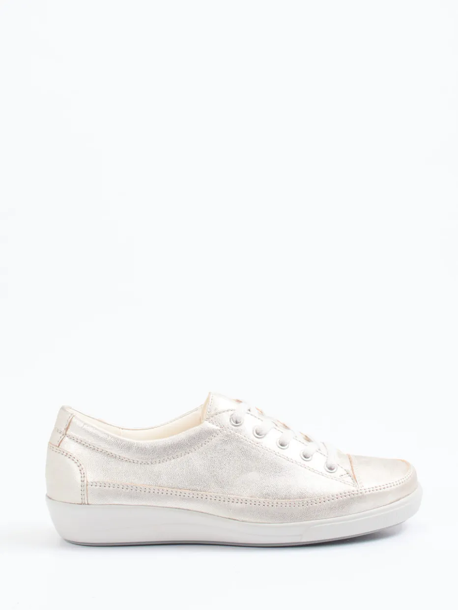 Perfekt für entspannte Tagesaktivitäten vereint der Sneaker edles Metallicleder mit leicht glänzender Oberfläche in einem champagnerbeigen Farbton. Die flache, ergonomisch geformte Silhouette, gepolsterte Ferse und die shock-absorbierende Gummisohle mit 2 cm Laufhöhe bieten langanhaltenden Tragekomfort. Ton-in-Ton-Nähte und metallischer Schimmer setzen dezente Akzente, während die klassische Schnürung optimalen Halt verleiht. Ideal kombinierbar zu hellen Jeans oder einer Crossbody-Bag im gleichen Ton.