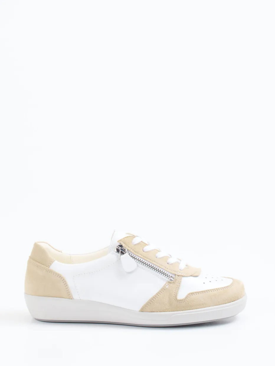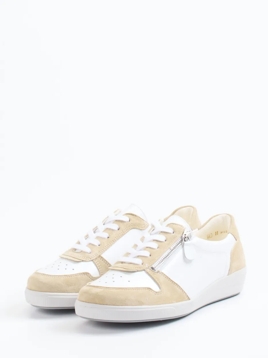 Stilvoll durchatmen im Alltag.Dieser Damen-Komfort-Sneaker von Christian Dietz vereint hochwertigen Materialmix mit alltagstauglichem Design. Für entspannte Wege in der Stadt oder im Café um die Ecke überzeugt der Schuh mit seiner Kombination aus schneeweißem Glattleder und beigem Veloursleder – glatt und leicht genarbt für dezente Struktur. Die klassische flache Silhouette wird durch eine perforierte Zehenpartie sowie einen silberfarbenen Reißverschluss aufgelockert. Ergänzt durch eine flexible Gummisohle und Innenpolsterung mit Lederfutter eignet er sich ideal für komfortorientiertes, minimalistisches Styling. Ein Highlight für den Quiet-Luxury-Trend mit funktionalem Anspruch. Christian Dietz steht hier für durchdachten Komfort in klarer Formsprache.
