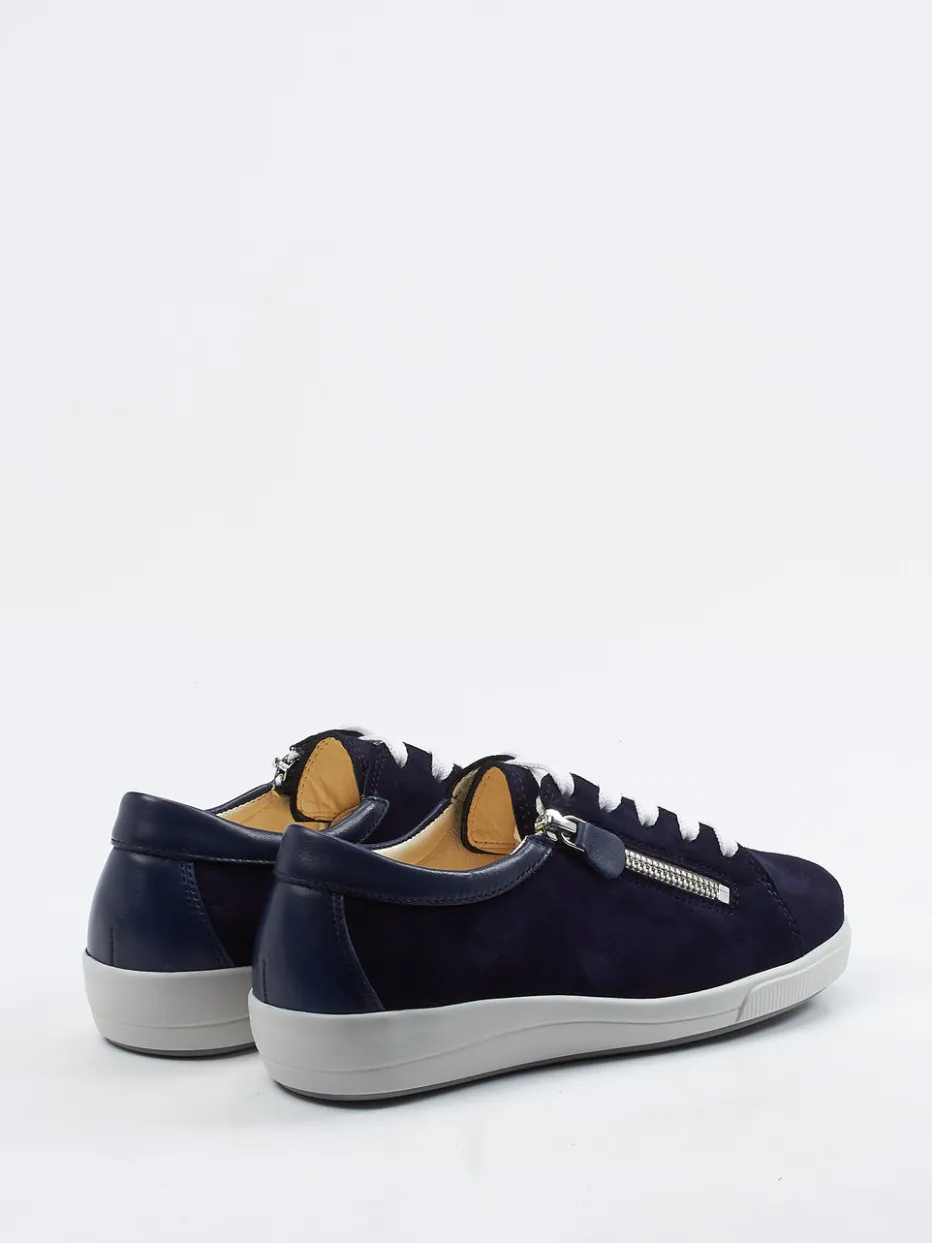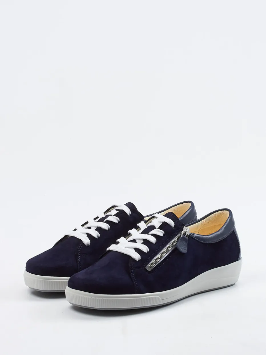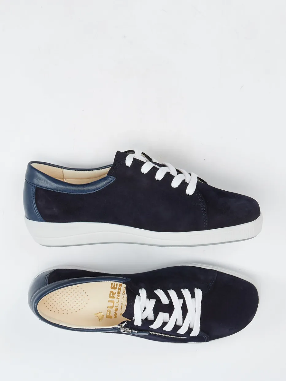 Veloursleder in Marine und eine flexible Gummisohle vereinen sich hier zu einem bequemen Damensneaker mit funktionalem Reißverschluss und austauschbarem Korkfußbett.