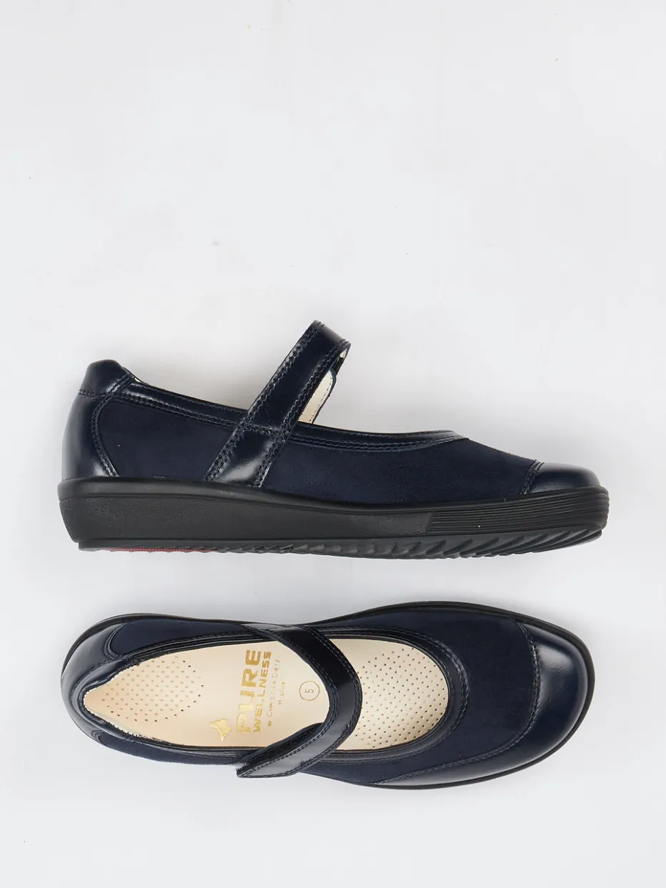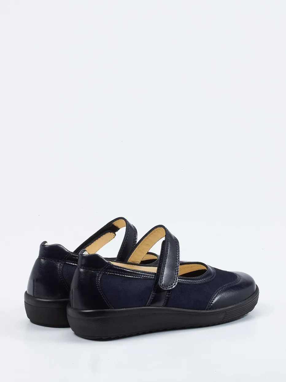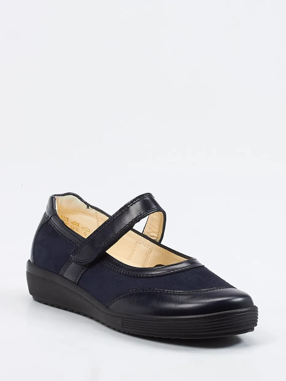 Christian Dietz präsentiert mit diesen Mary Janes ein alltagstaugliches Komfortmodell für Damen. Gefertigt aus Stretchmaterial mit Velourscharakter in Kombination mit dunkelblauem Kalbleder verbindet es höchsten Gehkomfort mit unaufdringlicher Optik.