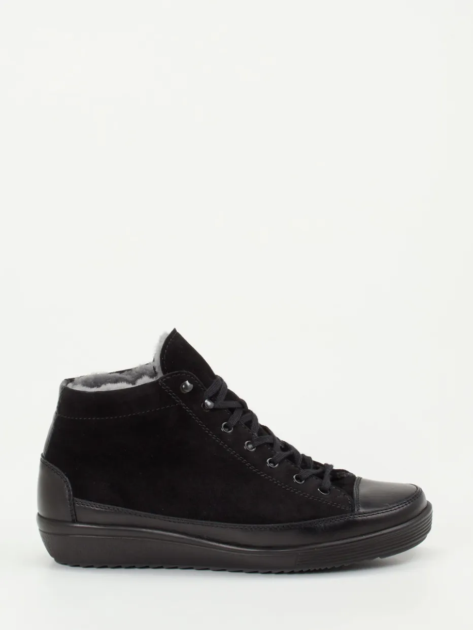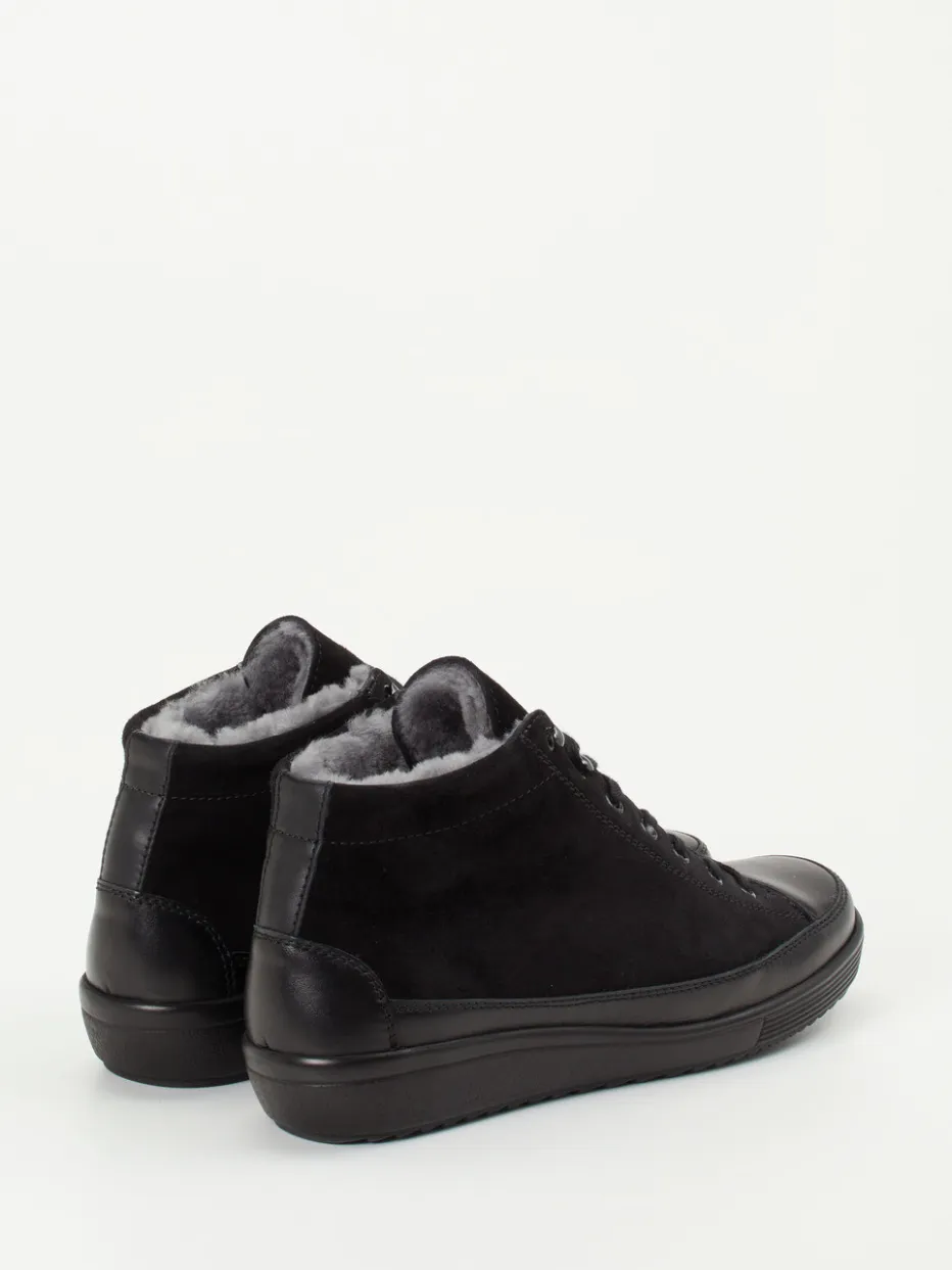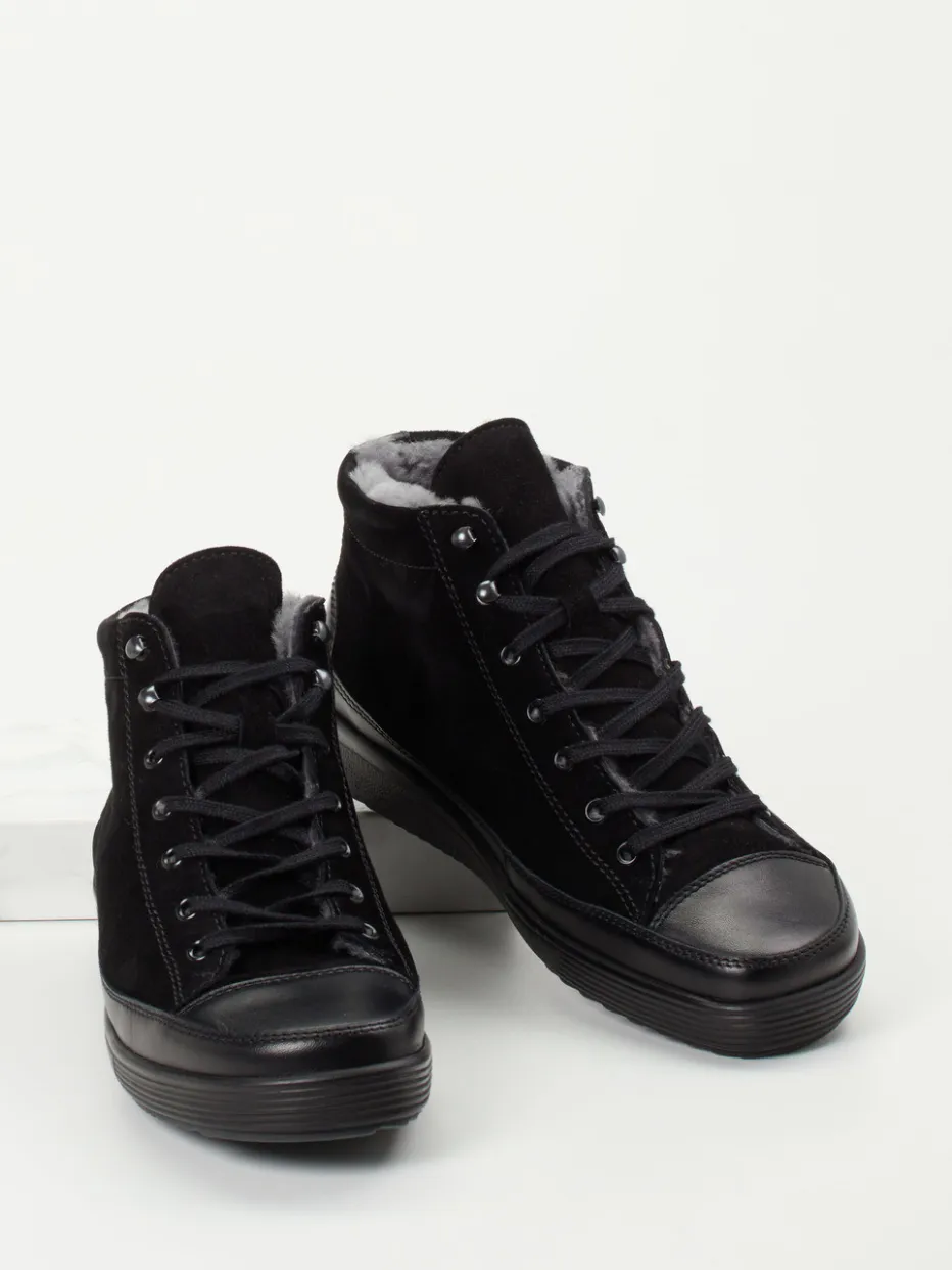 Schwarze Schnürboots von Christian Dietz vereinen samtig weiches Veloursleder mit funktionaler Wintertauglichkeit. Lammfellfutter und Luftpolstersohle sorgen für exzellenten Tragekomfort.