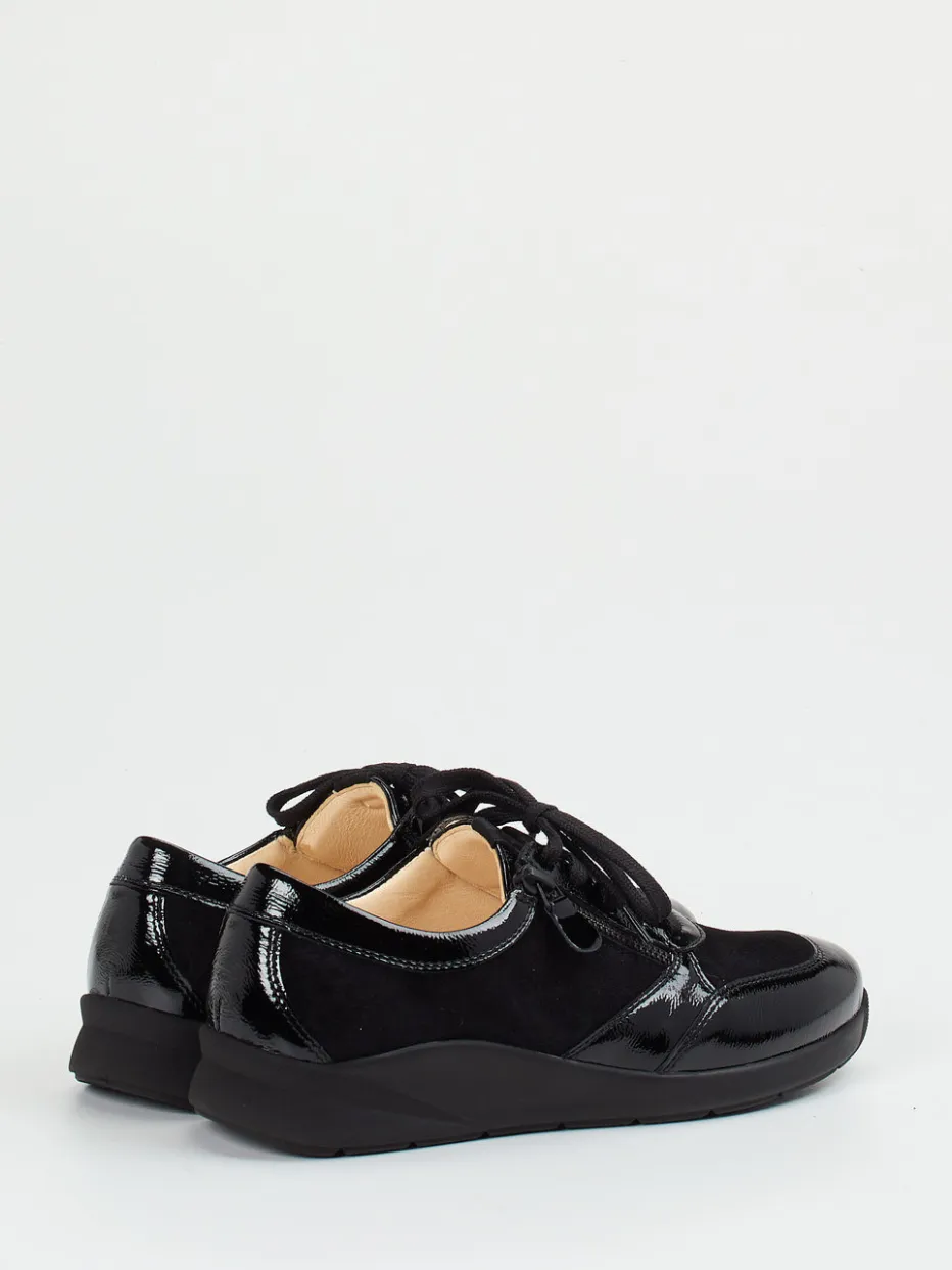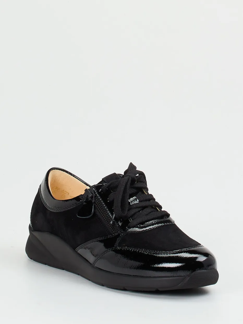 Dieser Komfort-Sneaker überzeugt mit edler Materialkombination aus samtigem Veloursleder und glänzendem Lackleder – funktional ergänzt durch Reißverschluss und herausnehmbares Fußbett.