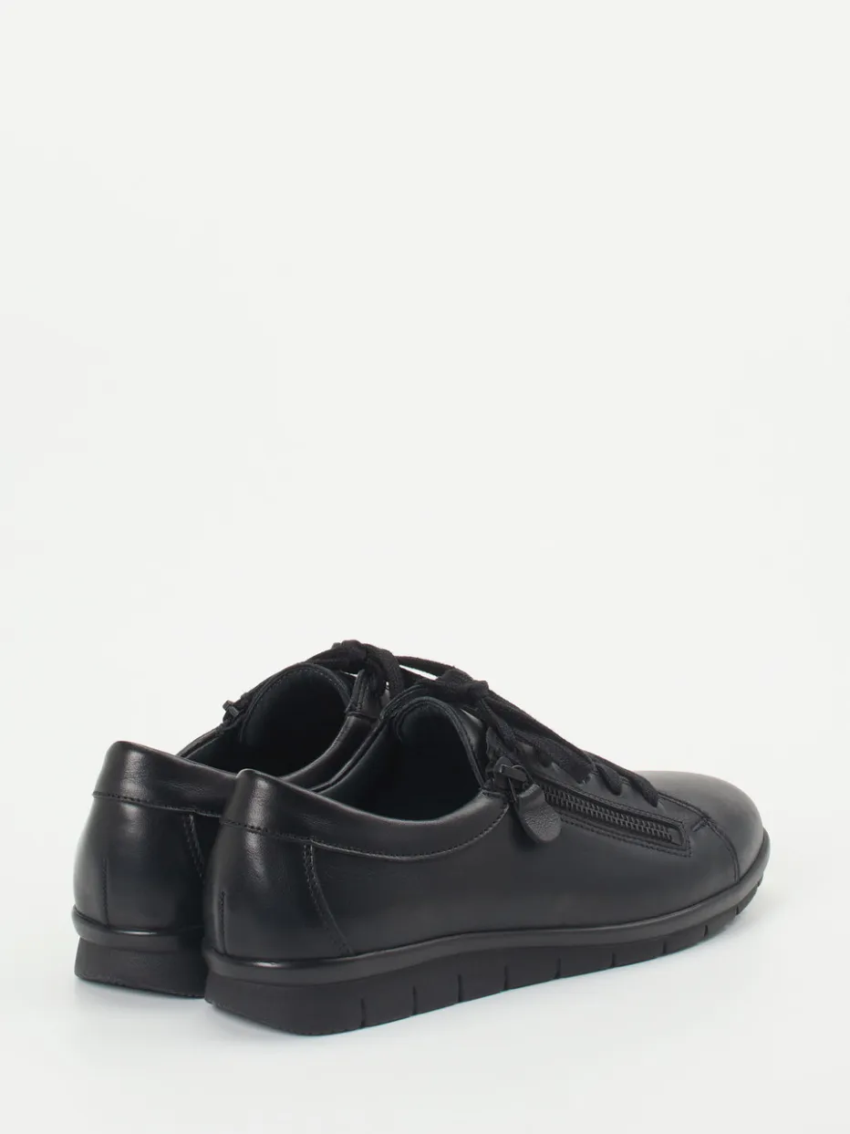 Schlichte Raffinesse für jeden Tag.Christian Dietz präsentiert stilvolle Komfort-Sneaker für Damen. Ob im Büro oder bei Erledigungen – dieser schwarze Schnürschuh erfüllt hohe Ansprüche an Bequemlichkeit und Design. Weiches Kalbleder mit dezentem Glanz trifft auf ein ergonomisches Innenleben samt gepolstertem, wechselbarem Fußbett. Die flache, abgerundete Form mit seitlichem Reißverschluss und Schnürung erleichtert das Anziehen. Dezente Ziernähte und die minimalistisch matt gehaltene Oberfläche unterstreichen die ruhige Eleganz. Rutschhemmende Flexsohle und weite H garantieren angenehmen und sicheren Laufkomfort. Zeitloses Design trifft bei Christian Dietz auf durchdachten Komfort.