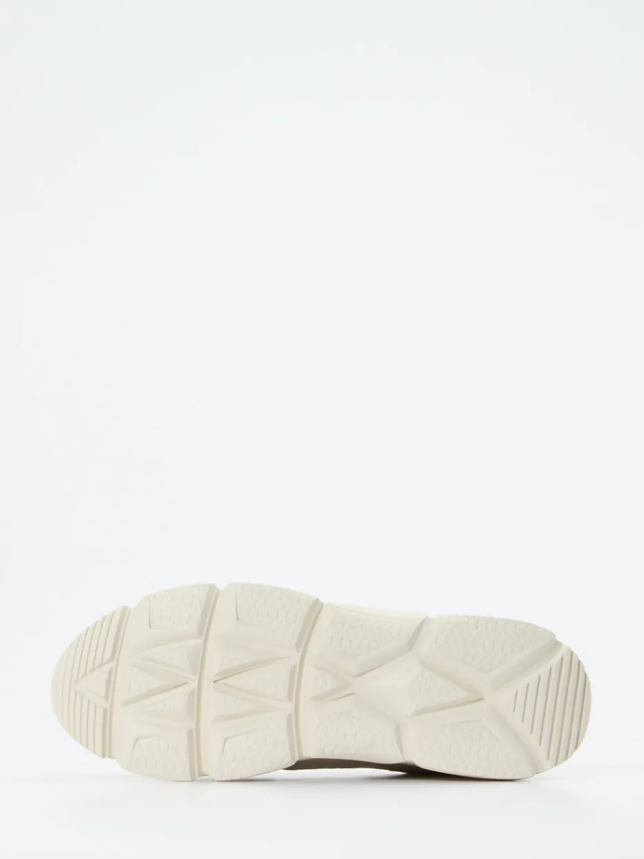 Ideal für entspannte City-Tage ist das Modell aus beigem Kalbleder mit tonalen Veloursleder-Overlays und dezenter Perforierung im vorderen Bereich gefertigt. Die auffällige Plateausohle aus Gummi unterstützt einen weichen Auftritt und orientiert sich stilistisch am Chunky-Trend. Das Innenfutter aus Leder und ein herausnehmbares Fußbett sorgen für angenehmen Tragekomfort. Silberfarbene Logos, gepolsterter Schaftrand und Zuglasche runden das Design funktional ab. Perfekt kombinierbar mit monochromen Freizeit-Looks.