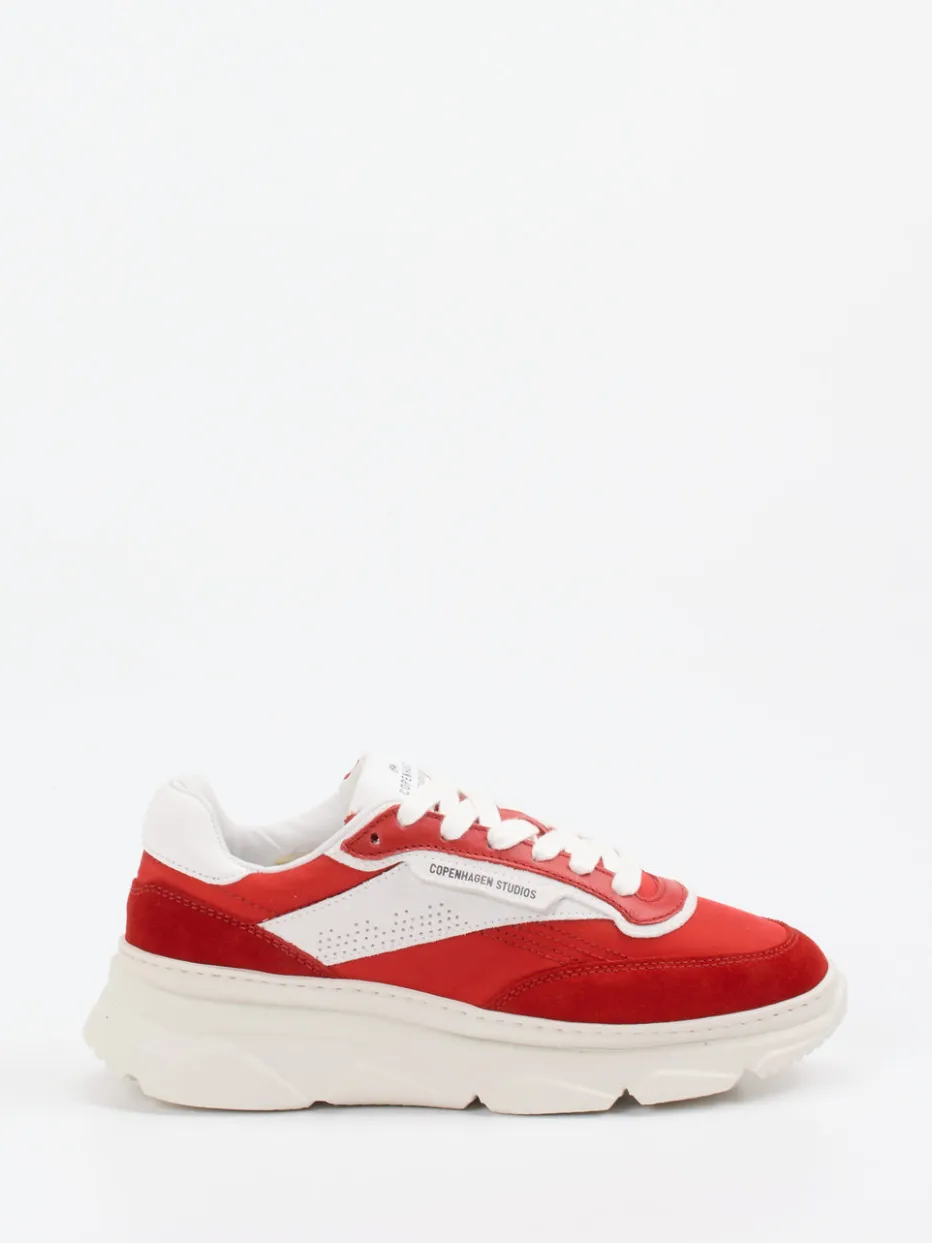 Dieser Sneaker von Copenhagen überzeugt mit signalrotem Veloursleder, harmonisch kombiniert mit Textil und weißen Kontrastdetails – perfekt für einen prägnanten Streetstyle-Auftritt.