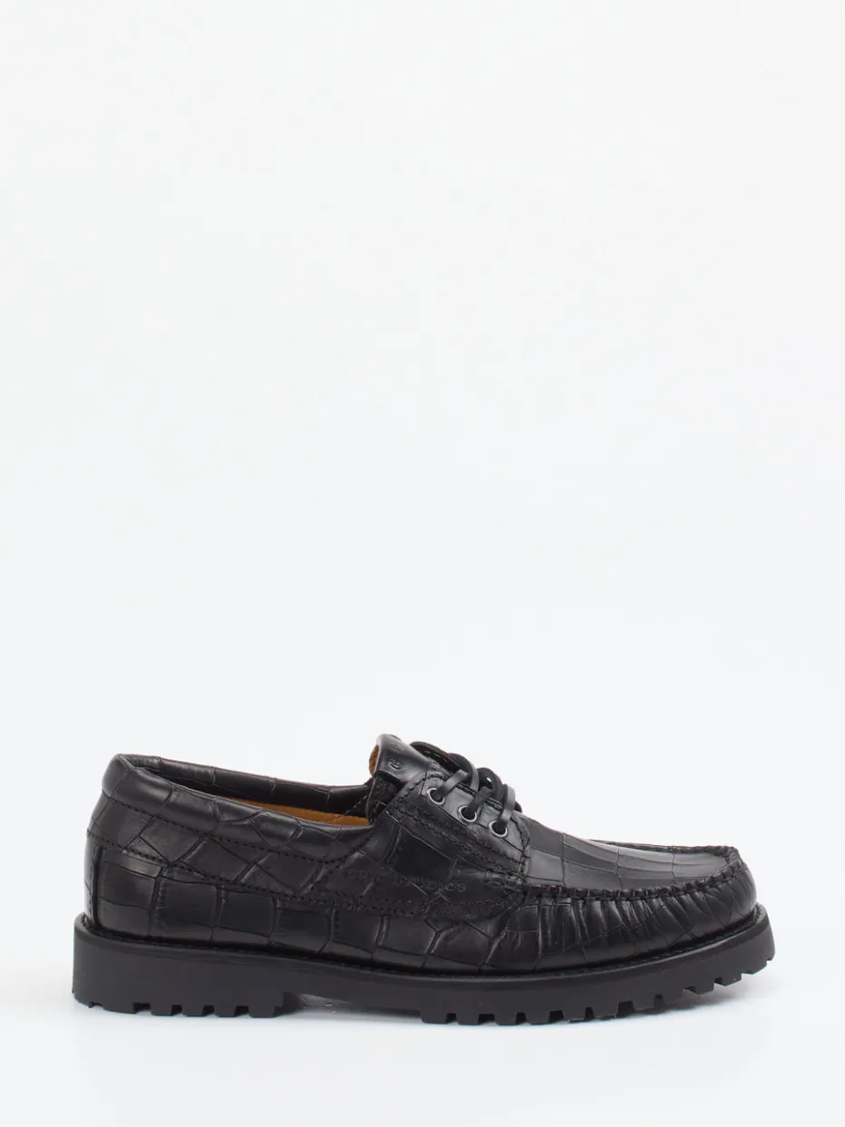Struktur trifft Stil.Die Marke Copenhagen zeigt mit diesem Herren-Modell in der Kategorie Derby-Schuhe Sinn für markantes Design und urbane Stringenz. Ideal für den Weg ins Büro oder ein stilvolles Freizeit-Outfit: Das Obermaterial aus schwarzem Kalbleder beeindruckt mit einer glänzenden Krokoprägung. Die klassische Silhouette wird durch Ton-in-Ton-Nähte und das seitlich geprägte Branding stilistisch ergänzt. Eine profilierte Gummisohle sorgt für Trittfestigkeit auch auf Outdoor-Untergründen, während eine Schnürung mit Metallösen den sicheren Sitz garantiert. Heritage-Elemente treffen hier auf minimalistisches Design – ganz im Zeichen von Quiet Luxury. Ein vielseitiger Begleiter mit strukturstarkem Charakter – typisch Copenhagen.