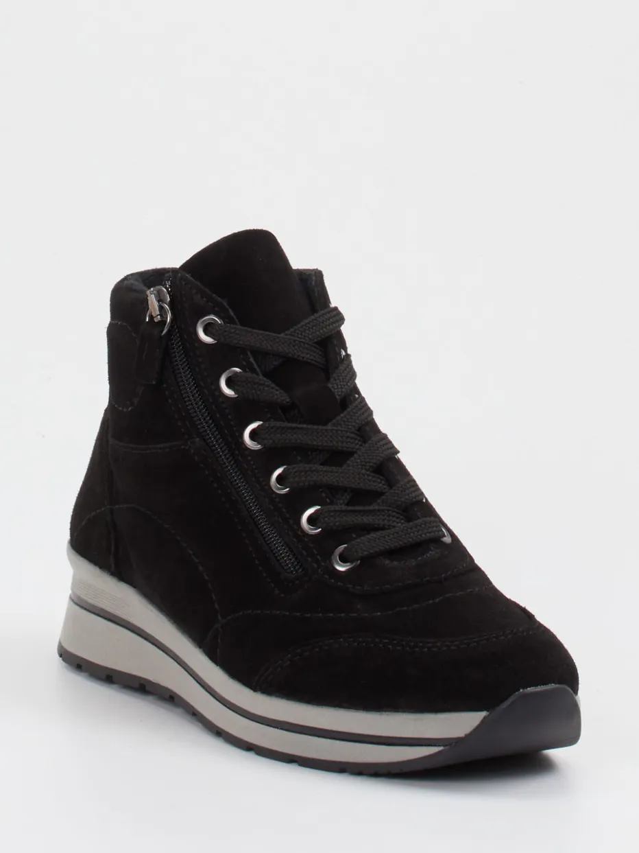 Casual-Chic für herbstliche City-Tage.Cypres Soft präsentiert mit dieser Sneaker-Stiefelette ein Modell, das Komfort und Stil harmonisch vereint. Ideal für entspannte Stadtspaziergänge oder den lässigen Alltag: Der knöchelhohe High-Top-Sneaker besteht aus schwarzem, matt texturiertem Veloursleder mit samtiger Haptik. Innenliegender Keilabsatz und flexible Gummisohle sorgen für ein angenehmes Tragegefühl und dezenten Auftritt. Ein silberner Reißverschluss an der Seite ergänzt die klassische Schnürung mit Metallösen und erleichtert das Anziehen. Die clean designte Silhouette und Ton-in-Ton-Nähte betonen den modernen Streetwear-Charakter. Cypres Soft steht für Komfort in femininer Casual-Ästhetik.