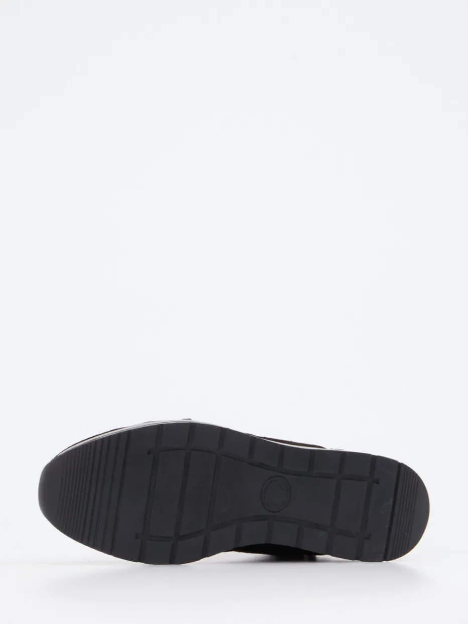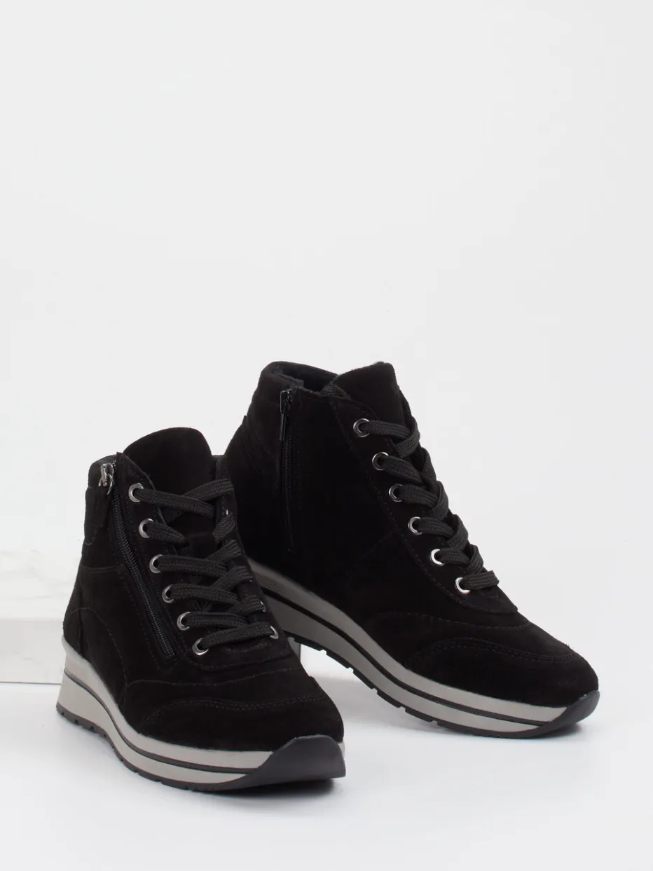 Der Keilabsatz verleiht dieser Sneaker-Stiefelette eine dezente Erhöhung, während das schwarze Veloursleder für einen stilvoll-schlichten Look sorgt.