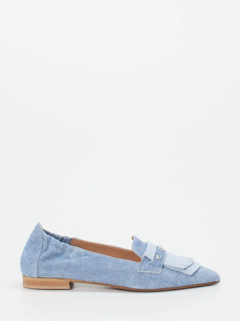 Sommertrend mit Fransenfaktor.Donna Carolina erweitert die Damen-Loafer-Kollektion um ein stilvolles Modell im Denim-Look. Ideal für urbane Sommertage ergänzt der Loafer mit spitz zulaufender Form jedes entspannte Trend-Outfit. Gefertigt aus hochwertigem Veloursleder, samtig angeschliffen, zeigt sich die Oberfläche genarbt und in Hellblau nuanciert. Fransenapplikation und silberfarbene Pyramidennieten setzen charakterstarke Akzente, während ein elastischer Fersenbereich den Einstieg angenehm flexibel gestaltet. Die flache Gummisohle mit naturbrauner Holzoptik fügt sich harmonisch ins Design. Im Kontext des „Denim-on-Denim“-Trends funktioniert er ideal zu Jeans oder hellen Crossbody-Bags. Ein italienisch inspirierter Loafer mit bequemem Aufbau und modischer Raffinesse.