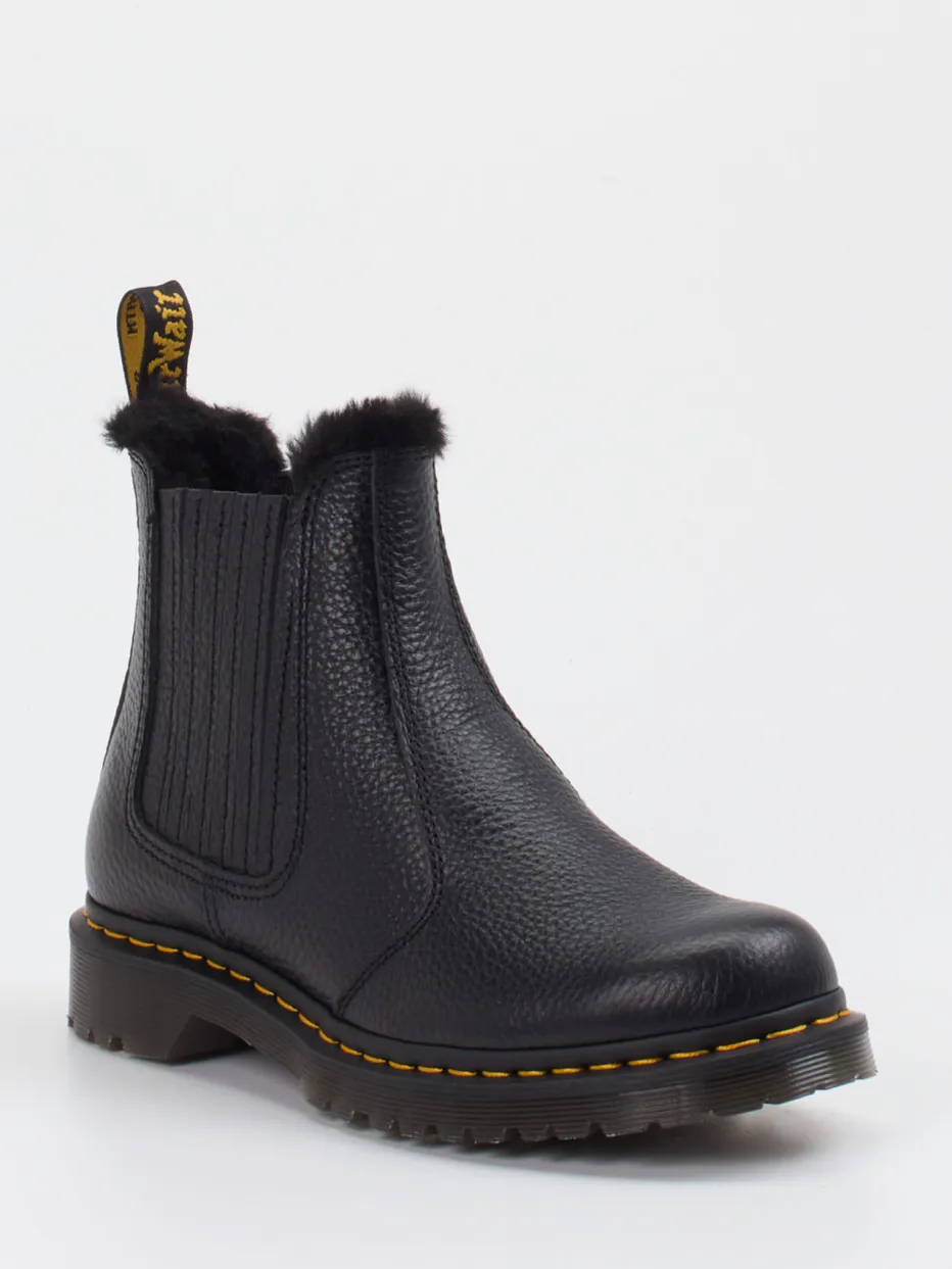 Winterfestes Update mit Kult-Charakter.Dr. Martens interpretiert die Chelsea Boots neu: mit klassisch-knöchelhoher Silhouette und markanter Streetwear-Note. Wenn Alltag auf kalte Wintertage trifft, punkten diese schwarzen Stiefeletten mit ihrer Kombination aus robustem Kalbleder und wärmendem Textilfutter. Die genarbte Oberfläche, elastische Einsätze sowie gelbe Kontrastnähte verleihen der Form einen funktional-modernen Charakter. Die Gummisohle mit tiefem Profil sichert Halt auf winterlichem Untergrund – ideal für Freizeit oder Outdoor-Aktivitäten. Zuglaschen mit Logo setzen ein markentypisches Detail. Authentischer Alltagsbegleiter mit ikonischem Workwear-Charme – für Stil und Komfort bei jedem Wetter.