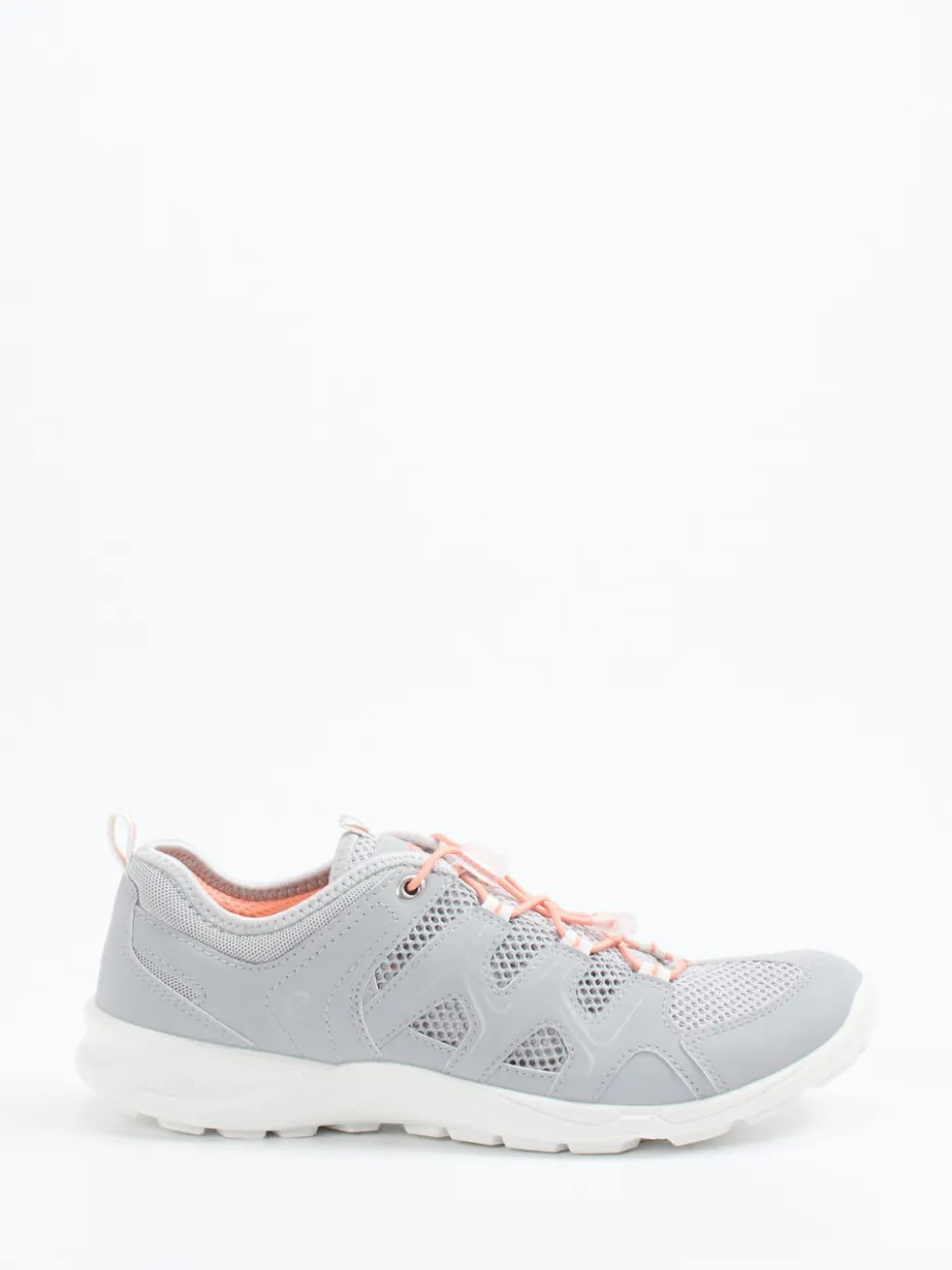 Sportlich leicht für aktive Tage.Die Marke Ecco präsentiert mit diesem Damen-Sneaker eine dynamische Lösung für sportliche Alltagsroutinen. Die Kombination aus atmungsaktivem Textil und synthetischen Verstärkungen in dezenter Mesh-Struktur sorgt für ein angenehm kühles Tragegefühl. Hellgrau mit soften Pfirsichakzenten, niedriger Schaftform und elastischer Schnellschnürung bietet er komfortbetontes Design mit funktionalem Anspruch. Das federleichte Modell besticht durch griffige Gummisohle mit Ecco-Fluidform-Technologie und austauschbarem Fußbett, ideal für Freizeit, Fitness oder leichte Outdoor-Aktivitäten. Minimale Logo-Details setzen zurückhaltende Markenakzente. Nordisch funktional – mit Ecco-Komfort für bewegte Sommertage.