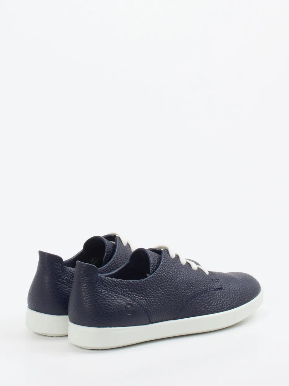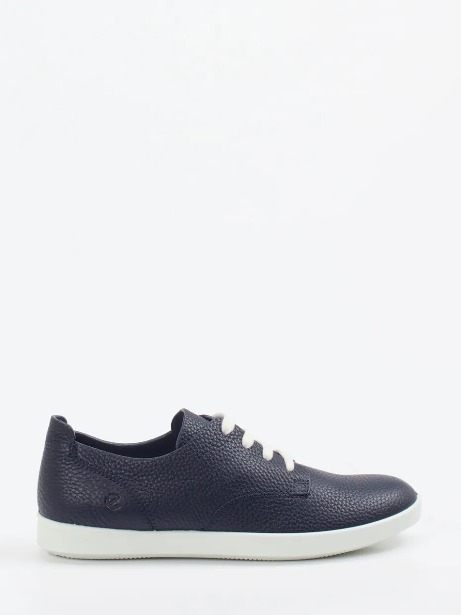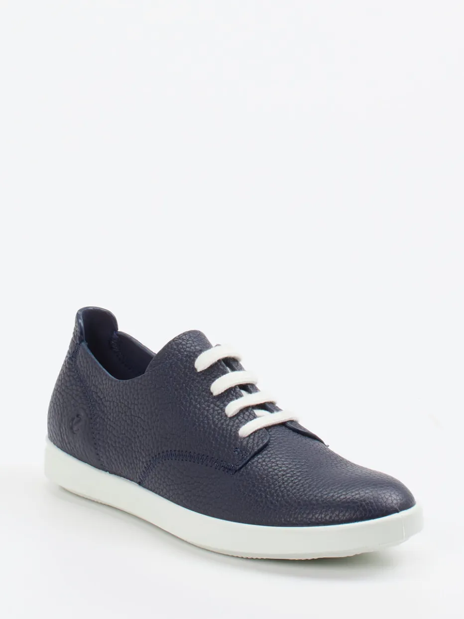 Schlichtheit trifft Komfort.Ecco präsentiert einen Casual-Sneaker für Damen aus dunkelblauem Kalbleder. Ideal für entspannte Alltagsmomente überzeugt das Modell mit seinem hochwertig genarbten Leder und der flach-runden Form. Die weiße Gummisohle sowie kontrastfarbene Schnürsenkel in Offwhite setzen dezente optische Akzente. Innen sorgt die gepolsterte Einstiegspartie für bequemes Tragen, das herausnehmbare Fußbett unterstützt individuelle Anpassungen. Inspiriert vom Trend „Quiet Luxury“, wirkt das puristische Design modern und souverän. Kombiniert zu Naturtönen oder minimalistischen Styles unterstreicht der Schuh eine lässig zurückhaltende Ästhetik. Understatement auf komfortablem Niveau – typisch Ecco.
