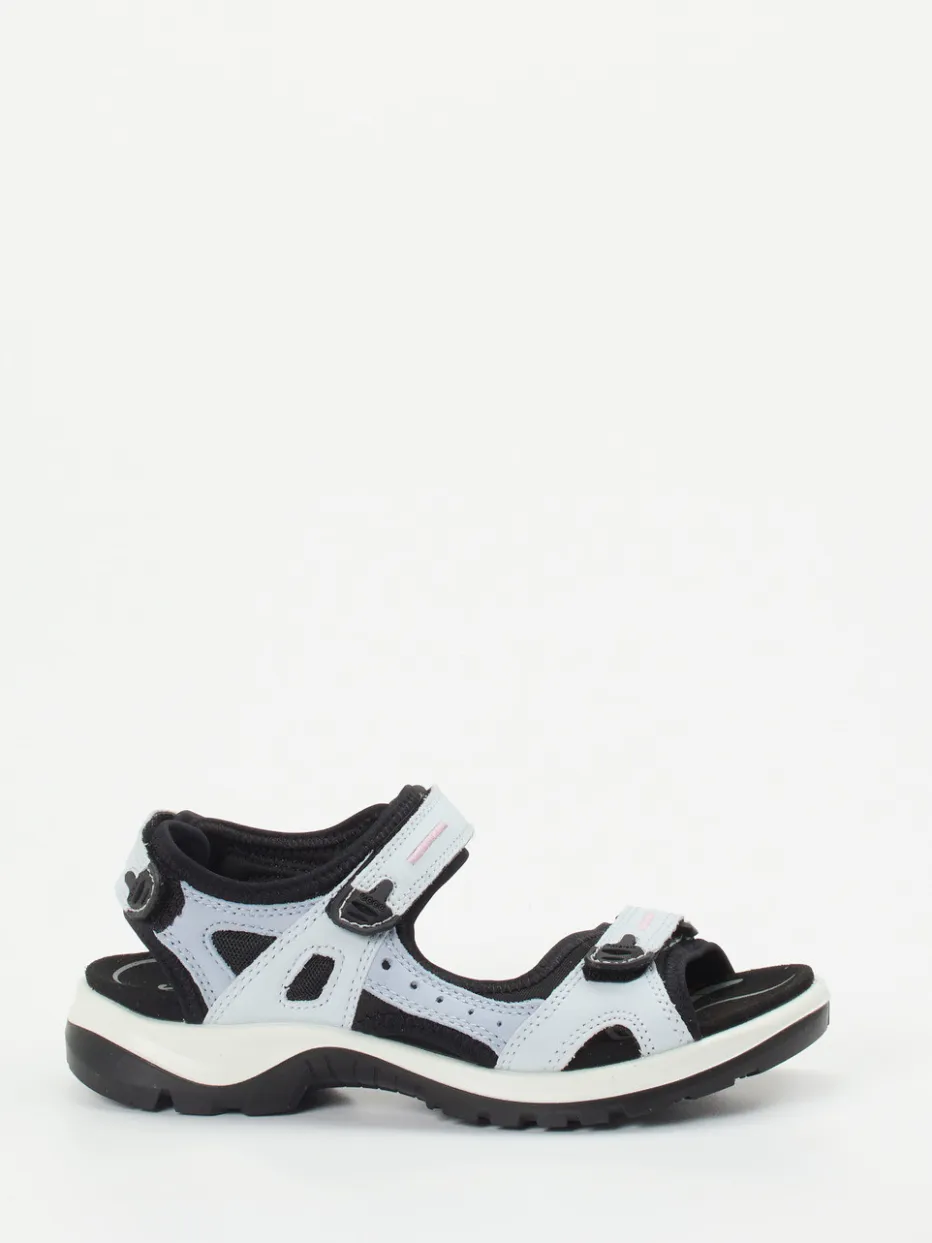 Komfort und Funktion für unterwegs.Ecco präsentiert eine Damen-Trekkingsandale, die sportive Lässigkeit mit durchdachter Funktion vereint. Ideal für Wanderungen oder aktive Sommertage überzeugt das Modell durch hellgrau-blaues Nubukleder, das samtig angeschliffen ist. Unterlegte Riemchen aus schwarzem Textil bieten angenehmen Tragekomfort, während Klettverschlüsse für eine individuelle Passform sorgen. Die offene, funktionale Silhouette mit ergonomischem Fußbett und rutschfester Gummisohle unterstreicht den Outdoor-Charakter. Dezente Kontrastnähte und ein Markenlogo runden das Erscheinungsbild ab. Inspiriert vom Gorpcore-Trend passt sie hervorragend zu Funktionsmode. Zuverlässige Performance trifft auf markentypische Alltagstauglichkeit.