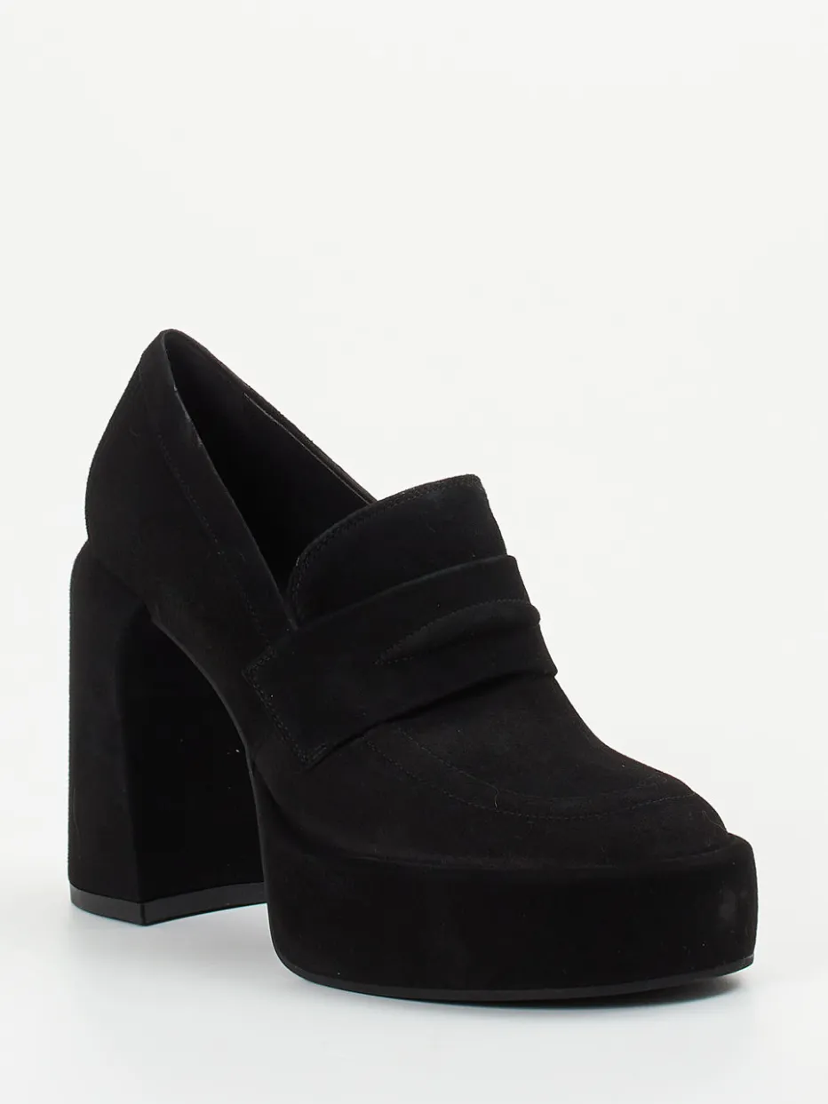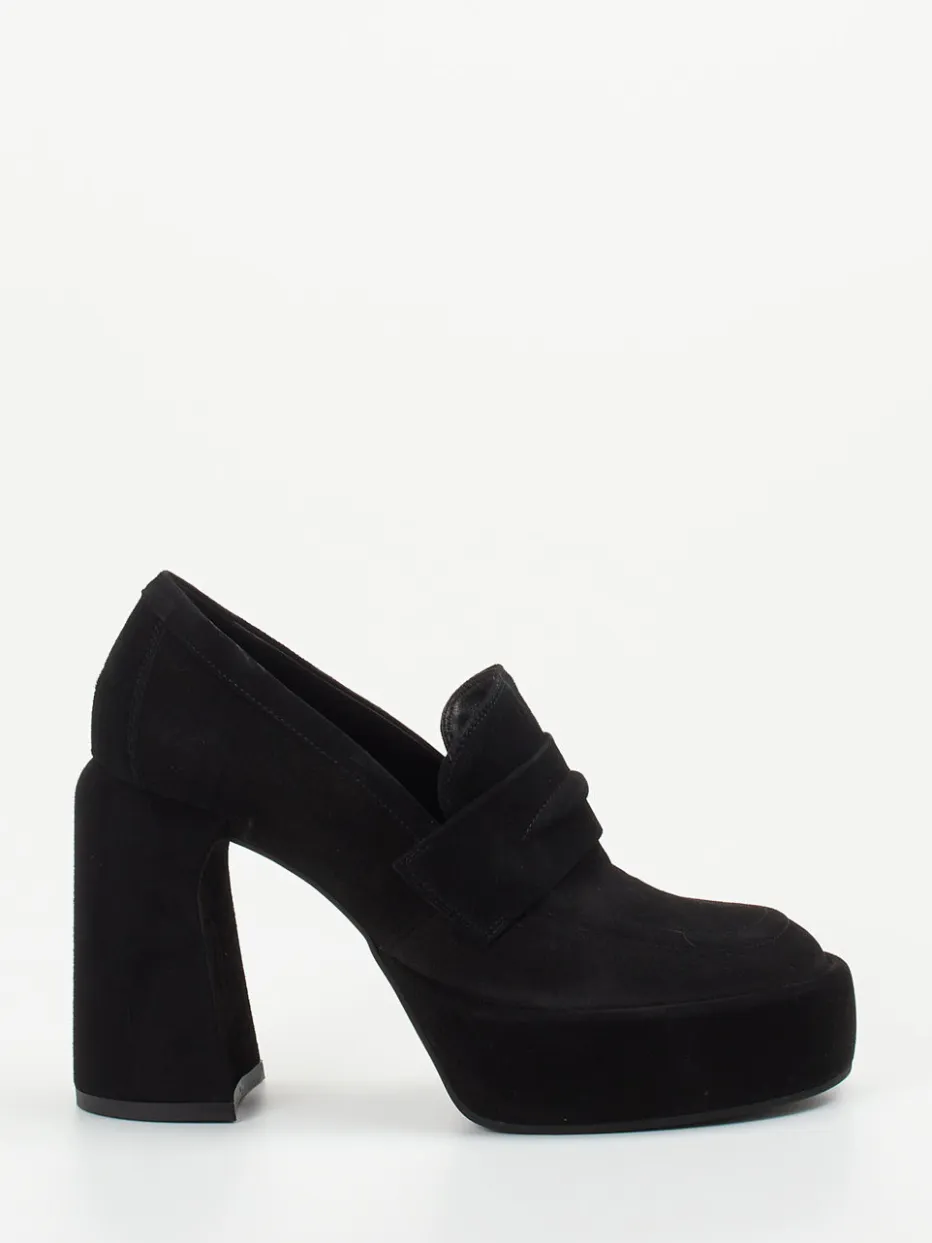 Ob für Business-Outfits oder Abendlooks – der Blockabsatz mit 10 cm Höhe und das Plateau sorgen für ausdrucksstarke Präsenz und angenehme Laufhöhe. Schwarzes, samtig angeschliffenes Veloursleder und tonige Steppnähte betonen den minimalistischen Charakter. Die schlupfähnliche Form ergänzt die klare Silhouette. Als modisches Statement passt dieser Loafer zu oversized Hosenanzügen oder monochromen Ensembles. Der 70s-inspirierte Look mit Quiet Luxury-Anklängen trifft den aktuellen Zeitgeist.