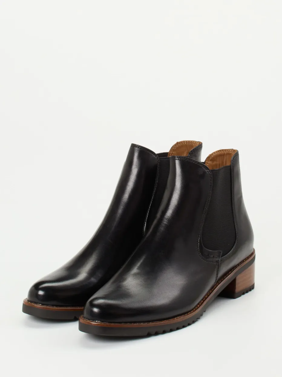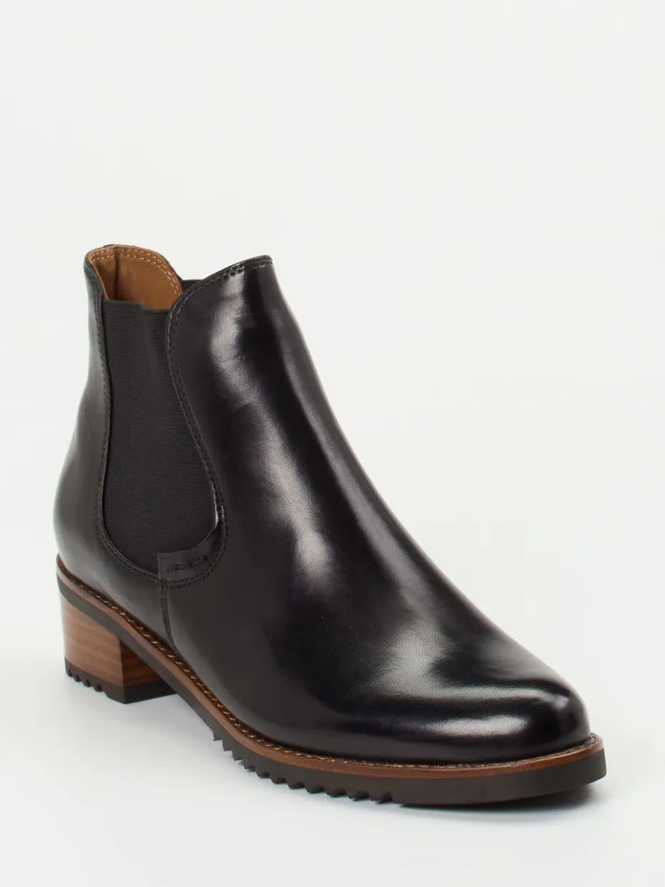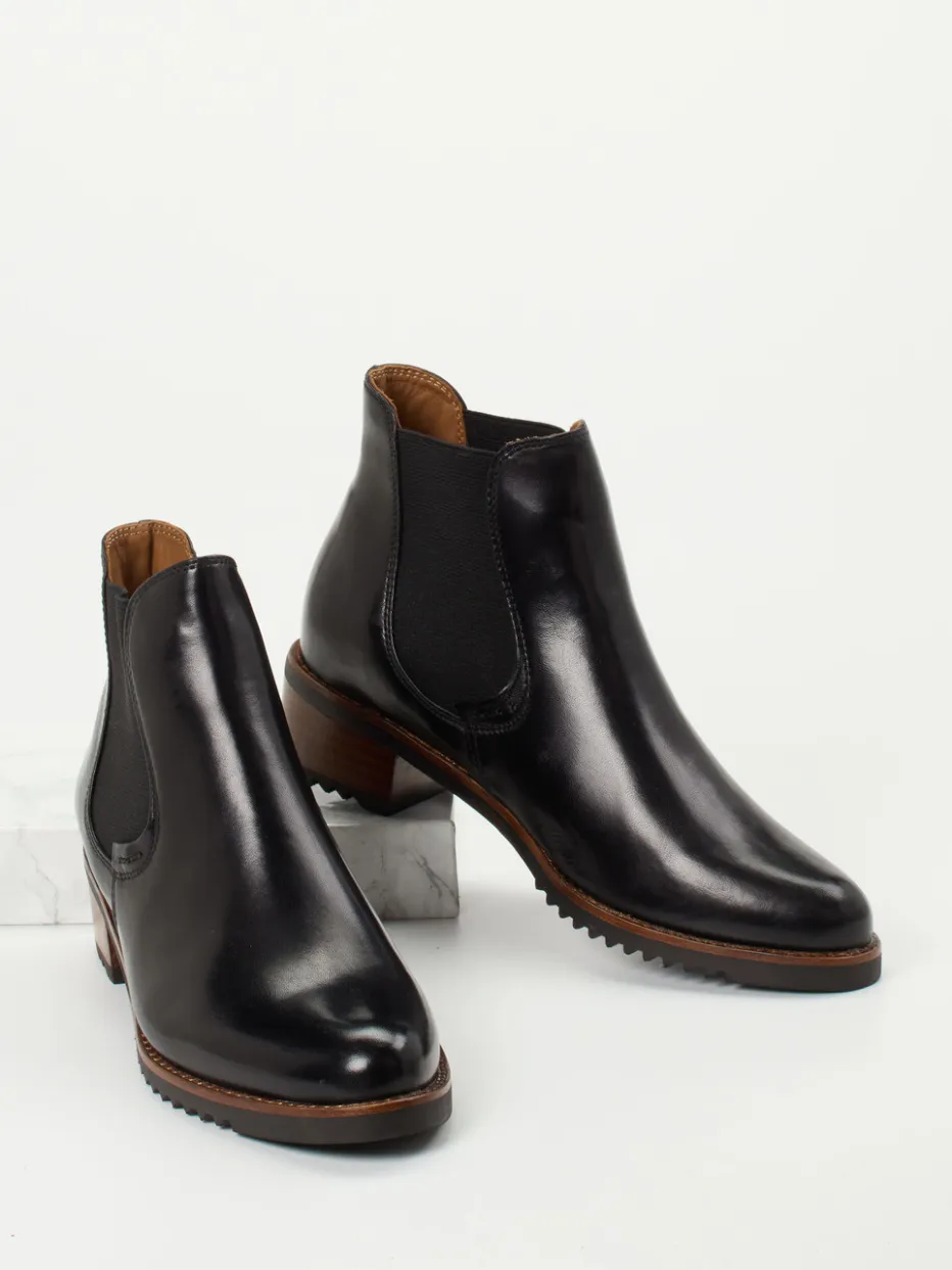 Fein glänzendes Kalbleder trifft auf formschöne Knöchelhöhe und robuste Profilsohle – das Design vereint klassische Eleganz mit zeitgemäßer Funktionalität.