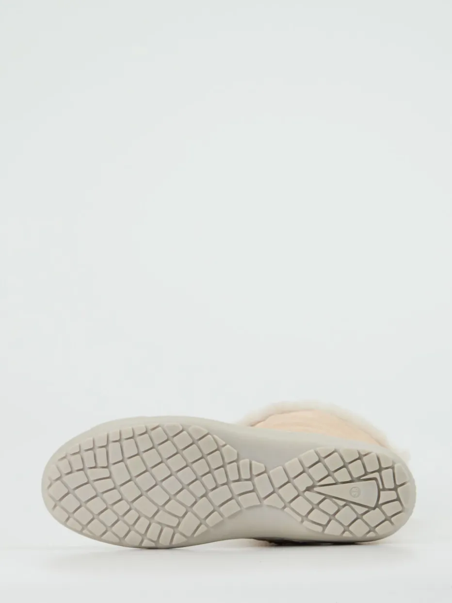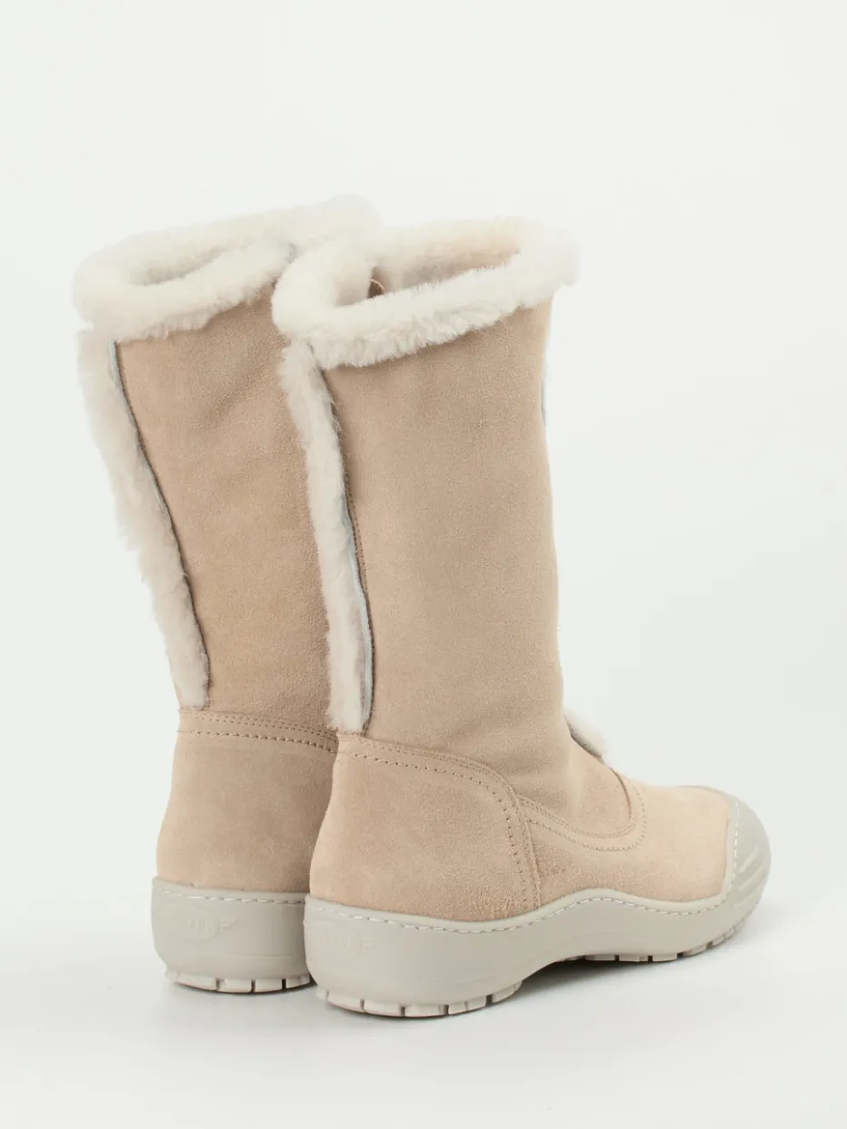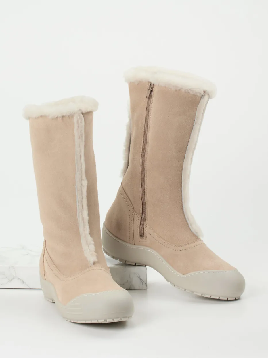 Ideal für frostige Spaziergänge in der City oder auf dem Land: Das beigefarbene Veloursleder wirkt matt und weich, ergänzt durch tonige Nähte und sichtbare Kunstfellbesätze. Das echte Lammfellfutter bietet Kälteschutz bis zur Wade, während der Innenreißverschluss das Anziehen erleichtert. Die taupefarbene Gummisohle mit griffigem Profil unterstützt sicheres Gehen auf winterlichen Untergründen. Stylingfreundlich zu Wollmänteln oder Steppjacken in ruhigen Naturtönen.