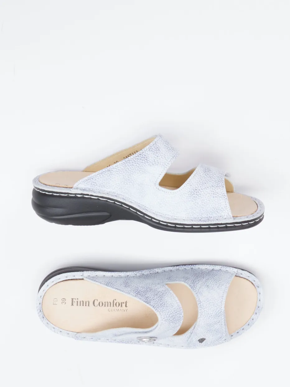 Stilvoll entspannen mit Komfort.Finn Comfort präsentiert diese Komfort-Pantolette für Damen – alltagstauglich und gesundheitsorientiert. Die individuell verstellbaren Klettverschlüsse bieten sicheren Halt bei maximalem Tragekomfort. Das perlmuttblaue, geprägte Leder mit dezentem Glanz und feiner Punktstruktur wirkt hochwertig und modern zugleich. Die ergonomische PU-Sohle mit leichtem Keil dämpft jeden Schritt, während das lederbezogene Korkfußbett das Fußklima optimal reguliert. Rutschhemmende Eigenschaften unterstreichen die Funktionalität bei relaxed-sportivem Design. Ein modischer Begleiter, der den „Quiet Luxury“-Trend auf besonders unaufgeregte Weise interpretiert. Innere Balance trifft auf handwerkliche Präzision – ein typisches Qualitätsmerkmal von Finn Comfort.