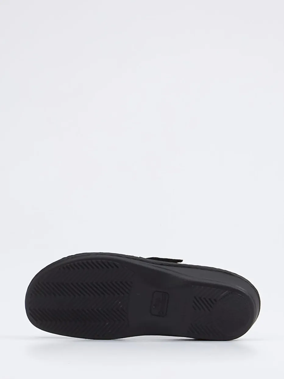 Ideal für entspannte Tage zu Hause oder komfortbetonte Alltagswege: Das weiche schwarze Kalbleder, ergänzt durch eine matte Oberfläche und Ton-in-Ton-Nähte, unterstreicht die klare Formsprache. Ein praktischer Klettverschluss ermöglicht individuelle Anpassung. Das lederbezogene Korkfußbett ist ergonomisch geformt, herausnehmbar und eignet sich für eigene Einlagen. Die flexible PU-Sohle mit leichtem Keil wirkt rutschhemmend und unterstützt sicheres Gehen. Dezente Metallapplikationen betonen den funktionalen Look mit orthopädischem Anspruch. Kombiniert zu Loungewear oder Casual-Outfits entsteht ein unaufgeregter Komfortstil.