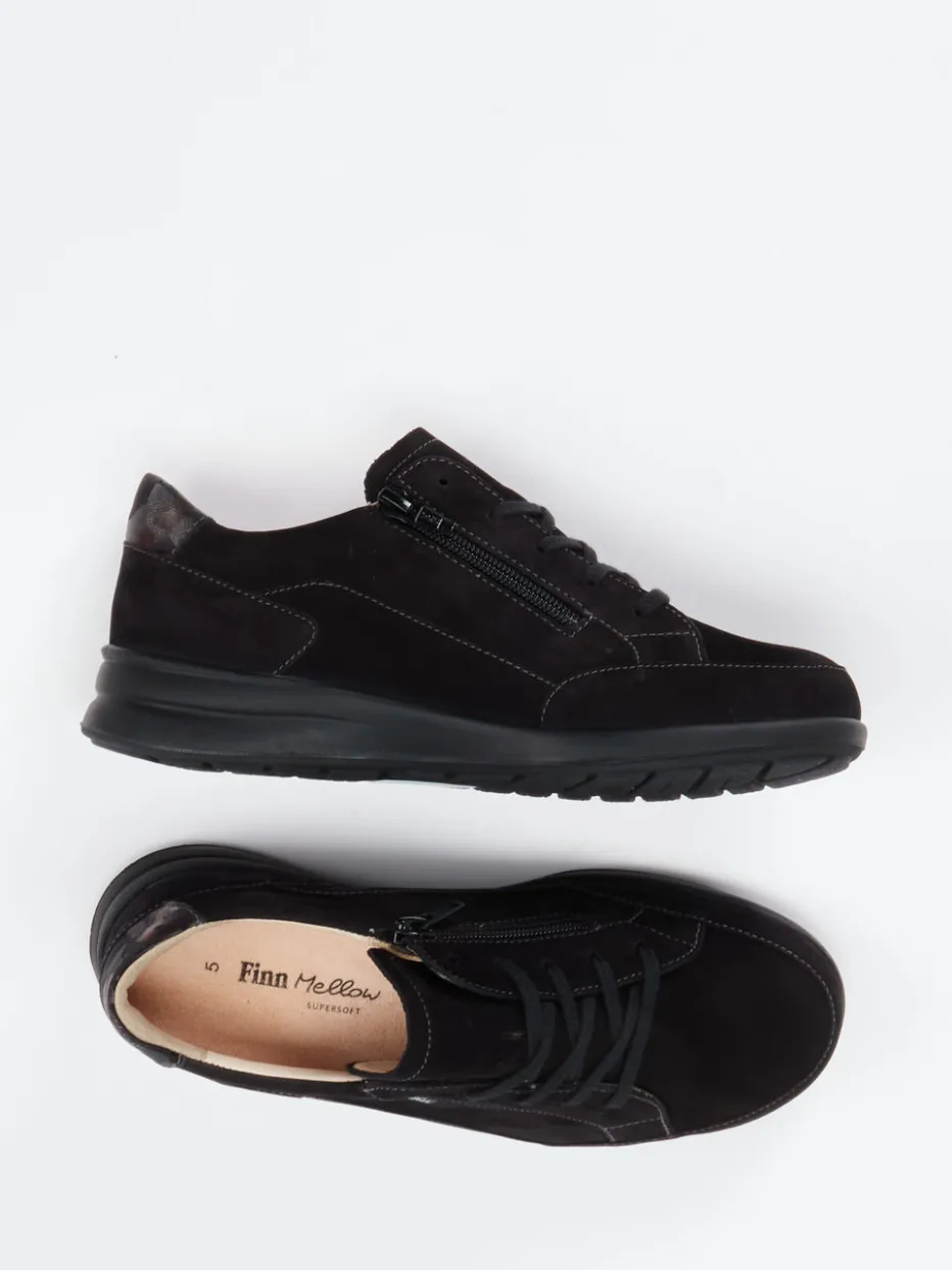 Sorglos durch den Tag.Finn Comfort präsentiert diesen komfortorientierten Damen-Schnürschuh der Kategorie Sneaker. Der gepolsterte Einstieg sowie ein seitlicher Reißverschluss ergänzen die klassische Schnürung für leichtes Anziehen und optimale Anpassung. Schwarzes Nubukleder mit samtig-matter Oberfläche trifft auf dezente Kontrastnähte und ein marmoriertes Fersendetail. Das lederbezogene, herausnehmbare Korkfußbett unterstützt orthopädische Ansprüche, während die rutschhemmende Gummisohle für Sicherheit sorgt. Ideal für entspannte Freizeitmomente und angesagte Quiet-Luxury-Looks. Komfort trifft auf Stil – typisch Finn Comfort.