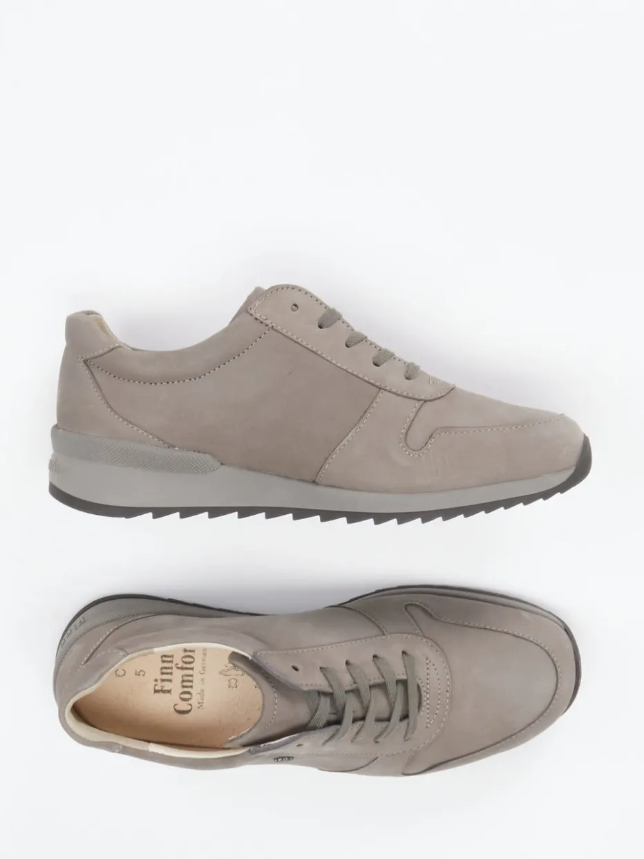 Bequem durch den Tag.Finn Comfort präsentiert mit diesem Komfort-Sneaker ein Damenmodell für lässige Alltagsmomente. Das taupefarbene Nubukleder wirkt in seiner samtig-matten Oberfläche besonders dezent und hochwertig. Die klassisch-sportliche Silhouette wird durch tonige Nähte, eine flexible Schnürung und ein dezentes Seitenlogo ergänzt. Das herausnehmbare, lederbezogene Korkfußbett bietet Platz für individuelle Einlagen und erhöht den Tragekomfort spürbar. Die profilierte Gummisohle sorgt für Trittsicherheit bei allen Freizeitaktivitäten. Minimalistische Streetwear-Einflüsse machen den Schuh vielseitig kombinierbar – etwa zu monochromen Relax-Looks. Ein stilvoll-funktionaler Begleiter mit spürbarer Markenqualität.