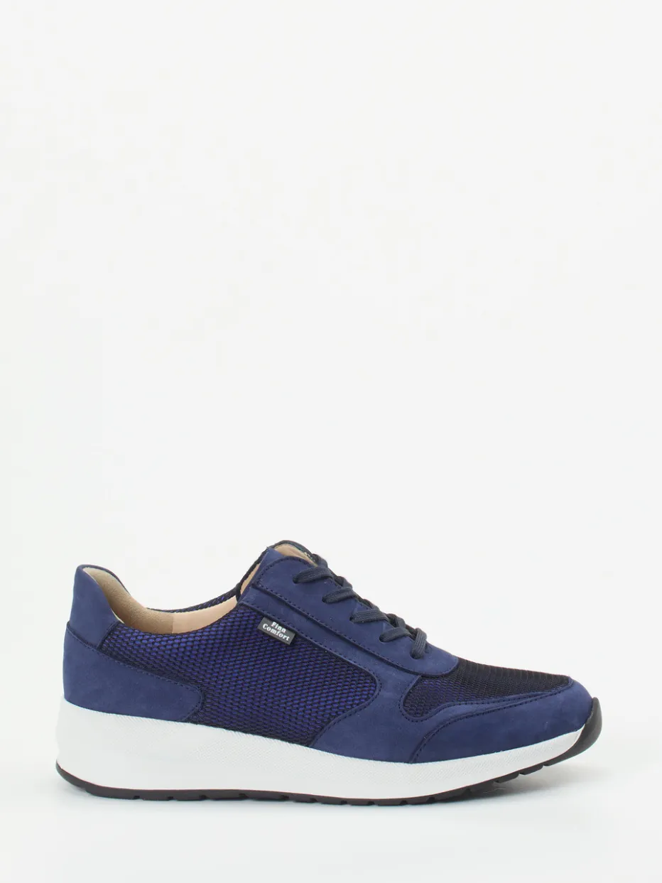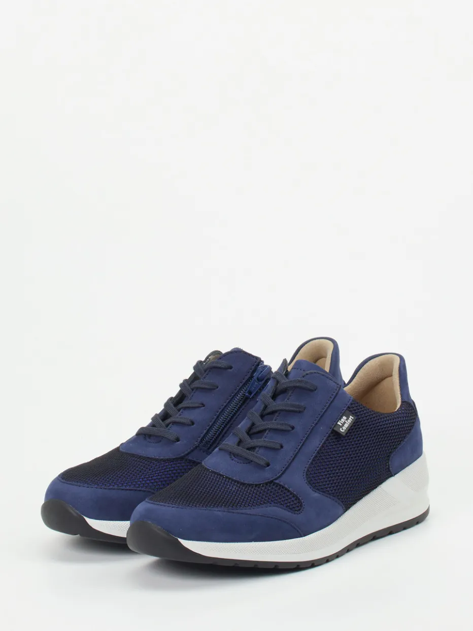 Komfort neu gedacht: sportlich und atmungsaktiv.Finn Comfort präsentiert mit diesem Komfort-Sneaker ein urban inspiriertes Modell für entspannte Momente. Ideal bei längeren Wegen oder im Alltag überzeugt das Modell durch elastisches Stretchleder in samtig-matter Optik sowie luftige Meshstrukturen. In Marineblau gehalten, zeigt die Silhouette eine klassische Sportlichkeit mit praktischen Details wie Schnürung plus seitlichem Reißverschluss. Das herausnehmbare Fußbett eignet sich hervorragend für individuelle Einlagen. Dezente Markenprägung und griffige Gummisohle betonen die Alltagstauglichkeit. Modisch im Trend mit dem Fokus auf Comfort Core und funktionale Ästhetik. Finn Comfort steht für hochwertige Verarbeitung und orthopädisch durchdachten Tragekomfort.