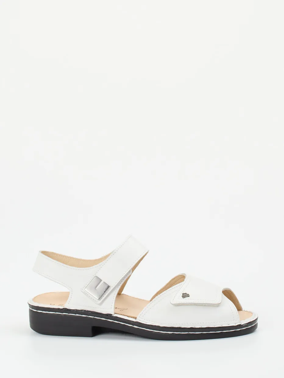Schlicht und komfortorientiert.Die Marke Finn Comfort präsentiert eine feminine Komfortsandale, die mit hochwertigem Design und Alltagstauglichkeit überzeugt. Das fein verarbeitete weiße Kalbleder sorgt mit seiner glatten, matten Oberfläche für ein angenehmes Tragegefühl, ergänzt durch ein lederbezogenes Korkfußbett. Die ergonomisch geformte Silhouette mit zwei justierbaren Klettverschlüssen und einer silberfarbenen Schnalle an der Seite bietet sicheren Halt. Eine flexible PU-Sohle mit leichtem Absatz und rutschhemmendem Profil unterstützt bequemes Gehen – ob zuhause oder unterwegs. Die offene Form und die klaren Linien fügen sich in die Designsprache des Quiet Luxury ein. Ein komfortorientierter Begleiter mit langlebiger Wertigkeit und puristischer Eleganz.