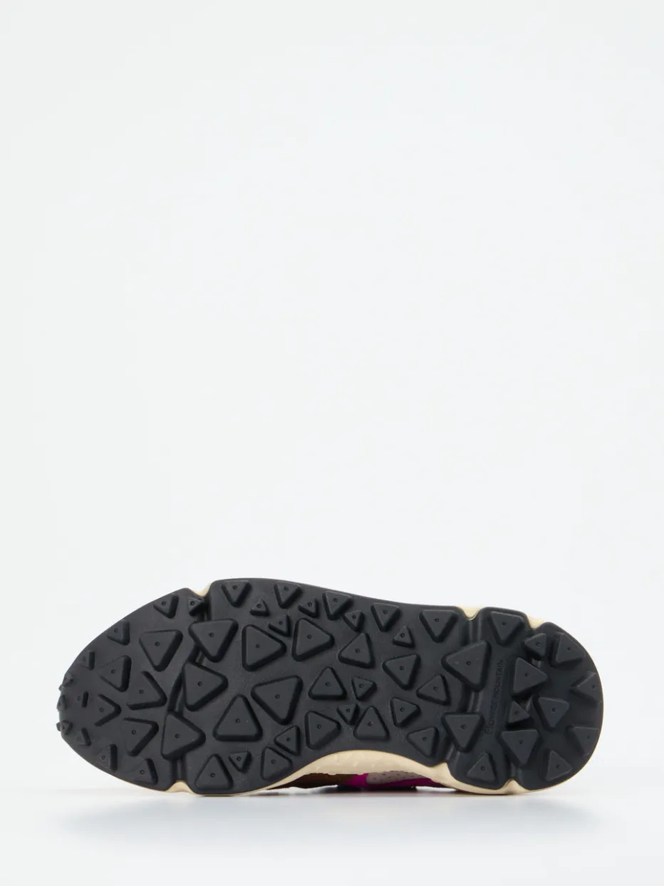 Mix aus Farbe, Funktion und Street-Style.Flower Mountain stellt mit diesem farbstarken Sneaker ein Statement-Modell für Outdoor-affine Looks vor. Ideal für Festival-Wochenenden oder urbane Abenteuer: Der Schuh kombiniert samtig mattes Veloursleder mit atmungsaktivem Textil und Patchwork-Einsätzen in Rosé, Flieder, Braun und Türkis. Die markant profilierte Gummisohle inspiriert sich am Trail-Look, während florale Perforationen, kontrastfarbene Schnürsenkel und eine sichtbare Kork-Innensohle modische Akzente setzen. Der Materialmix unterstützt eine leichte Konstruktion mit stabiler Silhouette. Ausdrucksstarke Farbgestaltung trifft bei Flower Mountain auf funktionales Design.
