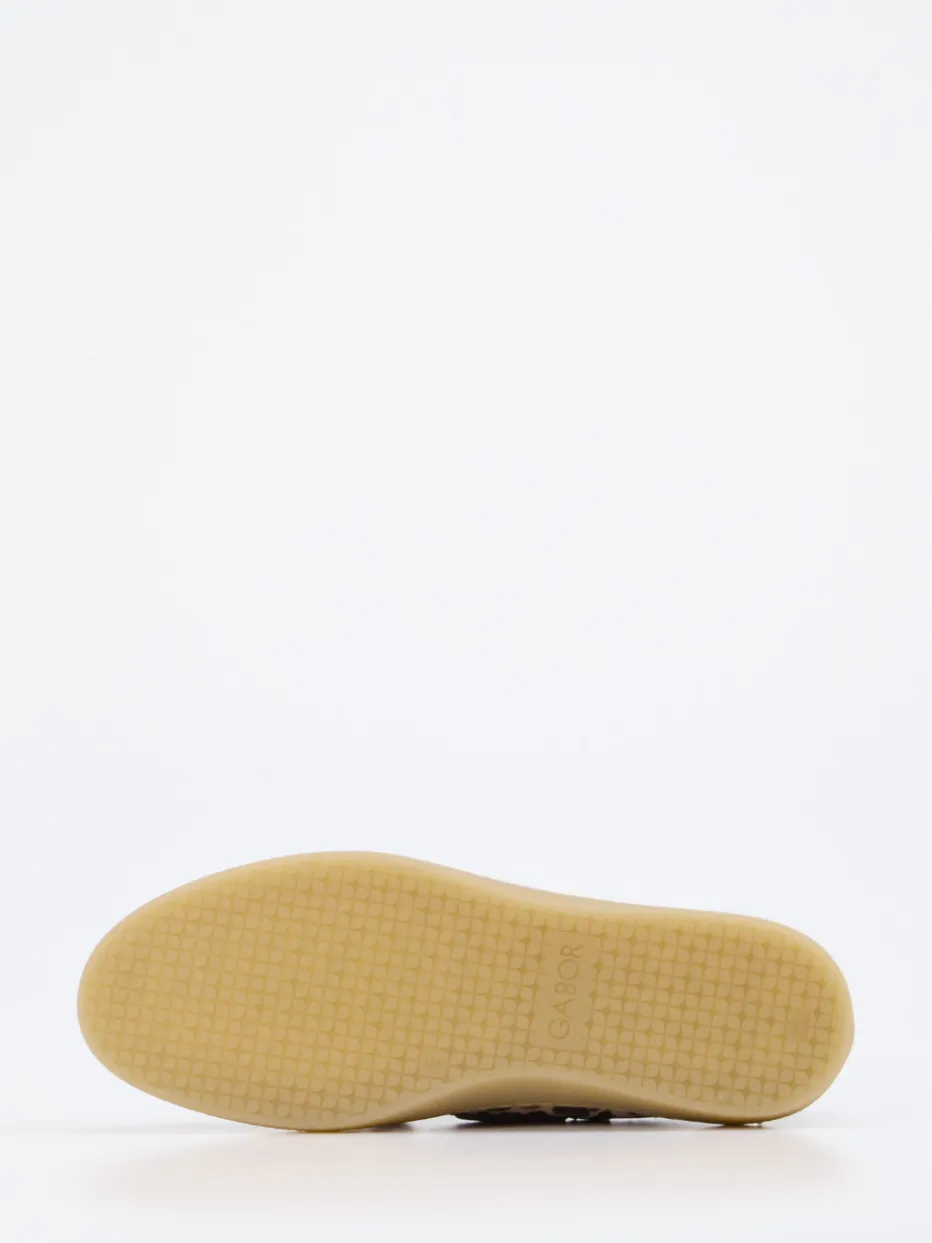 Sommerlicher Akzent mit Animal Print. Gabor präsentiert einen Damen-Bootsschuh, der mit trendigem Leoprint und hohem Tragekomfort punktet. Ideal für entspannte Urlaubstage oder den Stadtbummel an warmen Tagen: Das Modell überzeugt durch Veloursleder mit matter Textur und tonaler Schnürung. Die beigebraune Farbgebung wird durch dunkle Kontraste im Animal-Print und sichtbare Nähte stilvoll ergänzt. Eine flach-runde Silhouette sowie die profilierte Gummisohle mit geringem Absatz sorgen für Bequemlichkeit. Ein femininer Freizeitstil mit Safari-Flair – inspiriert vom Natural Tones-Trend der Saison. Besonders harmonisch zu Naturtönen und leichten Sommerhosen. Ein Bootsschuh mit Statement-Print und markentypischem Komfortgefühl.