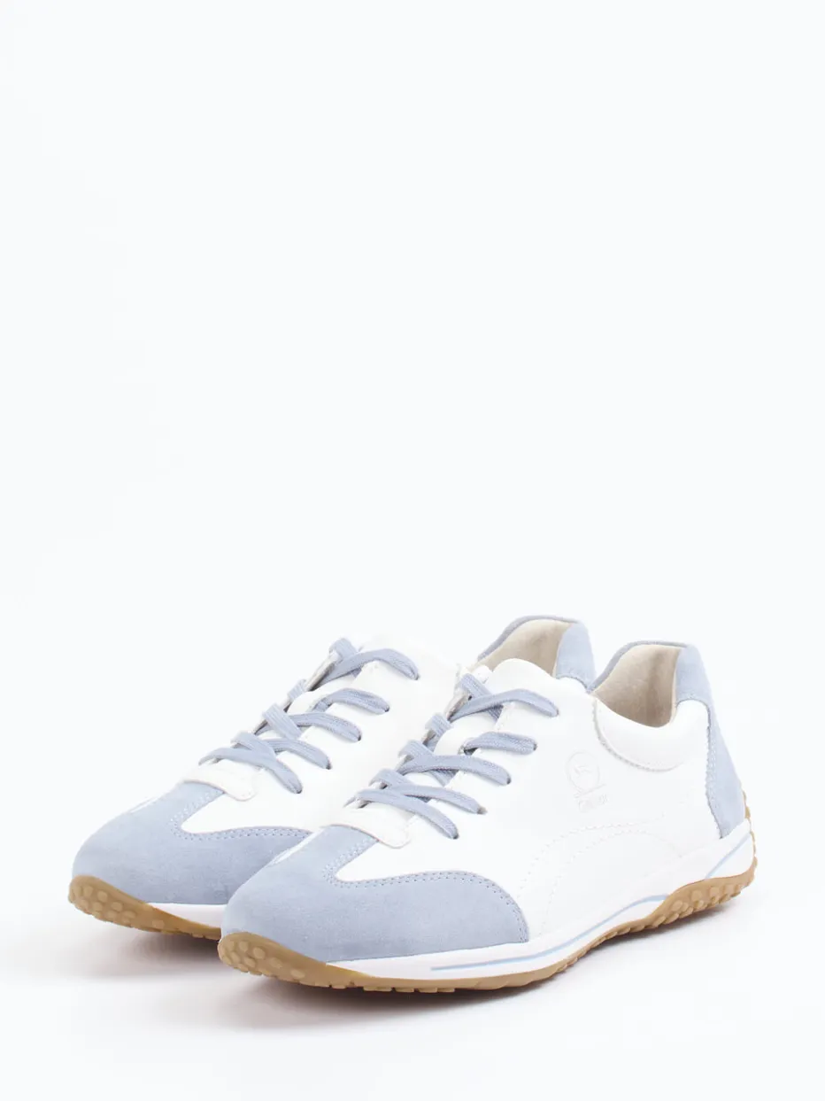 Moderner Komfort trifft Retro-Coolness.Gabor Comfort präsentiert einen Damen-Freizeitsneaker mit klassisch flacher Form und bequemen Sitz. Für entspannte Wege im Alltag punktet das Modell mit einer hochwertigen Kombination aus Velour/Leder – samtig angeschliffen in Pastellblau und Glattleder in Weiß. Die strukturierte Gummisohle mit Kontrastlinie sorgt für sicheren Tritt, während der weich gepolsterte Einstieg sowie das atmungsaktive Textilfutter ein rundum angenehmes Tragegefühl bieten. Die Ton-in-Ton-Nähte, das reduzierte Design und retroinspirierte Anklänge ergänzen aktuelle Minimalismus-Trends perfekt. Passt hervorragend zu luftigen Baumwollhosen und pastelligen Accessoires. Leichter City-Sneaker mit Gabor-typischer Komfortausstattung.