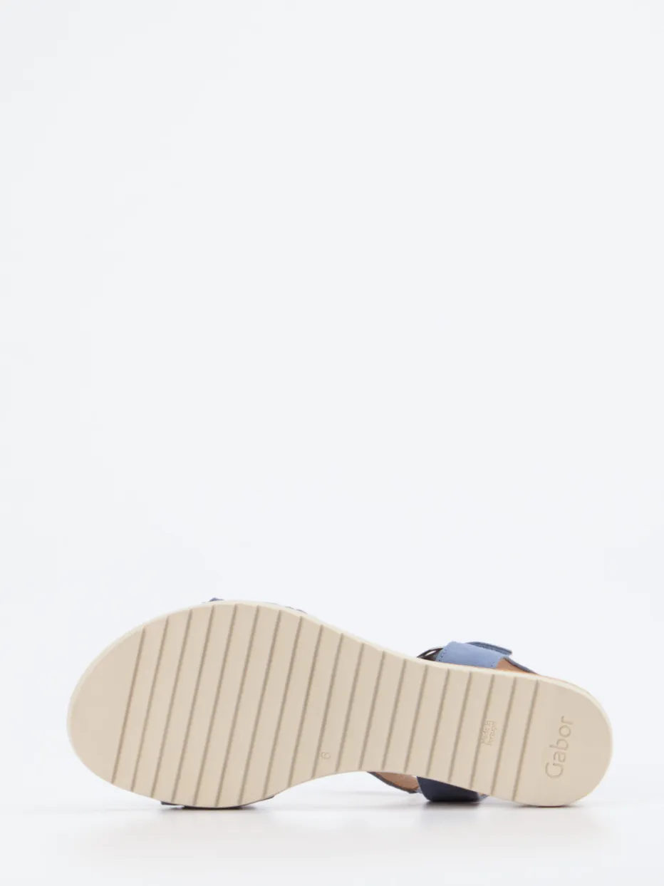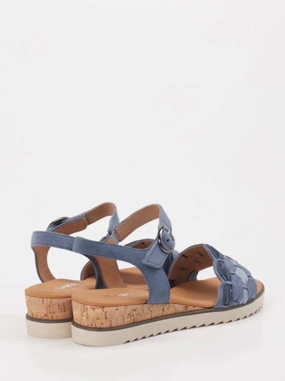 Als Keilsandaletten von Gabor Comfort verbinden diese Damenschuhe stilvolle Optik mit ergonomischem Anspruch. Ideal für entspannte Tage in der Stadt oder am Urlaubsort spenden die Sandalen mit blauem Veloursleder – ergänzt durch ein mikrofasernes Futter – ein besonders angenehmes Tragegefühl. Die offene, ergonomisch geformte Silhouette zeigt modische Details wie einen geflochtenen Vorderfußriemen und eine silberfarbene Schnalle am verstellbaren Knöchelriemen. Die leichte Korksohle mit rutschhemmendem Gummiprofil und ein weich gepolstertes Fußbett unterstreichen den hohen Komfort dieser Casualwear-inspirierten Sandale. Kombinierbar mit Leinenhose oder Sommerkleid. Die gelungene Verbindung aus Materialästhetik, Bequemweite G und saisonalem Trendbewusstsein überzeugt durch die markentypische Komfortlinie von Gabor.