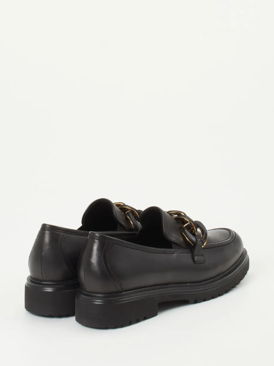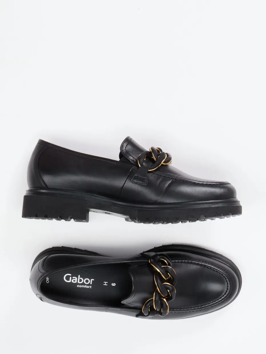 Stilvoll auftreten mit Komfortanspruch.Der Damen-Loafer von Gabor Comfort überzeugt als bequemer Trotteur mit eleganter Note. Für den urbanen Alltag und den gepflegten Büro-Look bietet dieses Modell aus schwarzem Kalbleder eine stilvolle Lösung. Eine goldfarbige Kettendekoration auf dem Blatt setzt einen wertigen Akzent. Die rutschhemmende Chunky-Profilsohle in Kombination mit der komfortablen Weite H und einem gepolsterten, herausnehmbaren Fußbett sorgt für angenehmen Tragekomfort. Die matte Lederoberfläche unterstreicht den minimalistischen Charakter, während dezente Streetwear-Einflüsse Modernität signalisieren. Perfekt kombinierbar zu Tailored Pants oder Strickkleid. Gabor Comfort steht für passformgerechtes Design mit stilistischer Präzision.