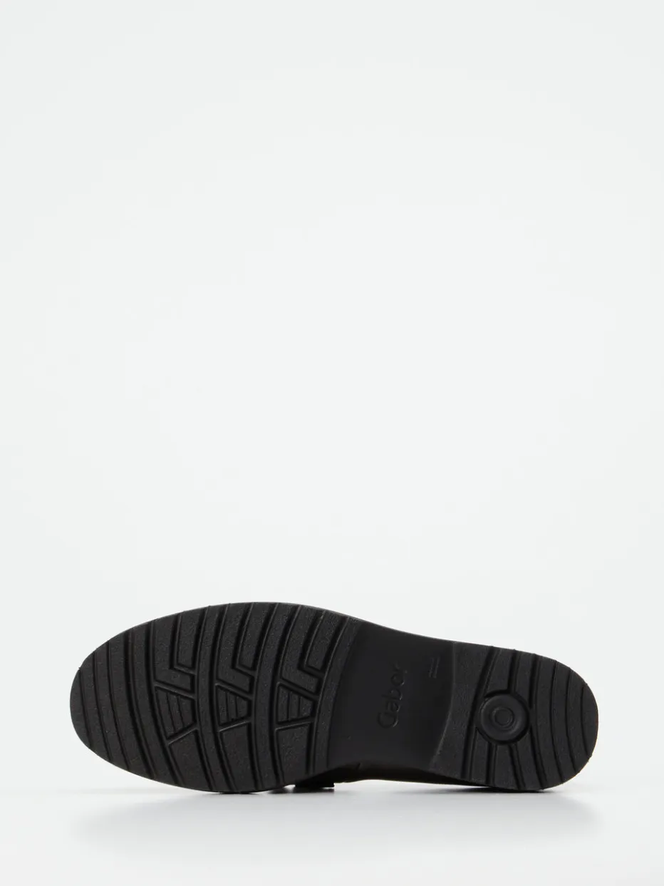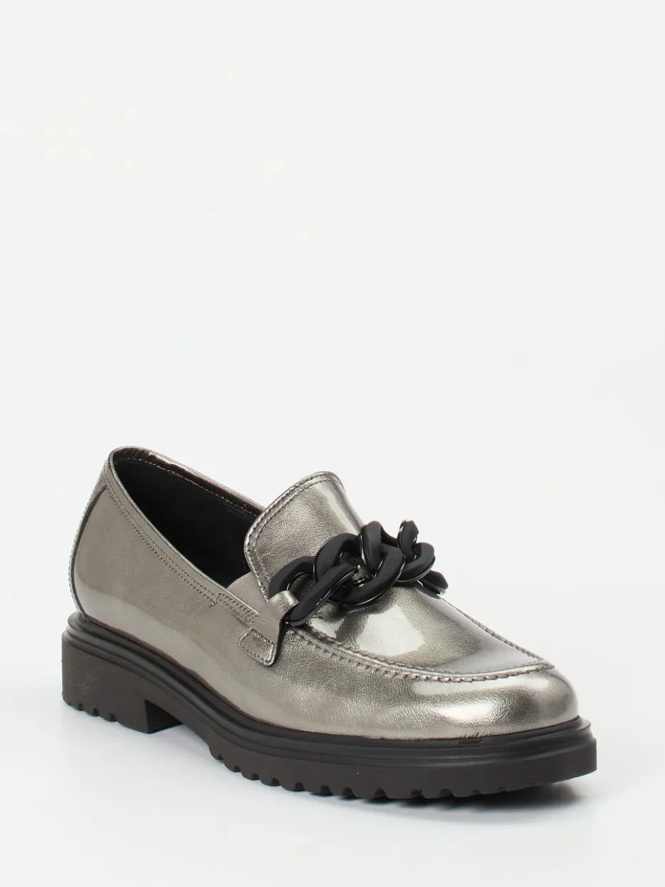 Der komfortable Loafer von Gabor Comfort verbindet glänzendes Lackleder mit modischer Kettendekoration – ein gelungener Mix aus Eleganz und urbanem Streetstyle.